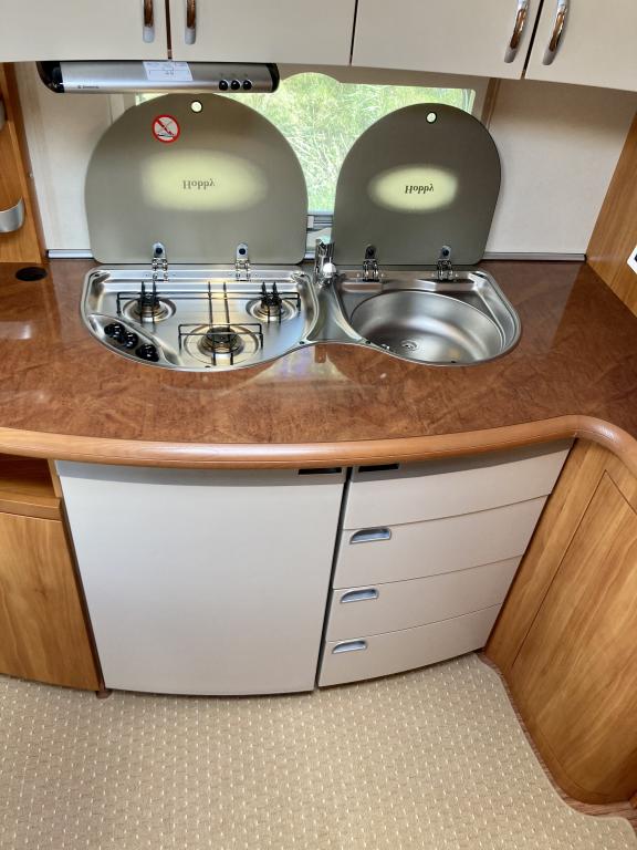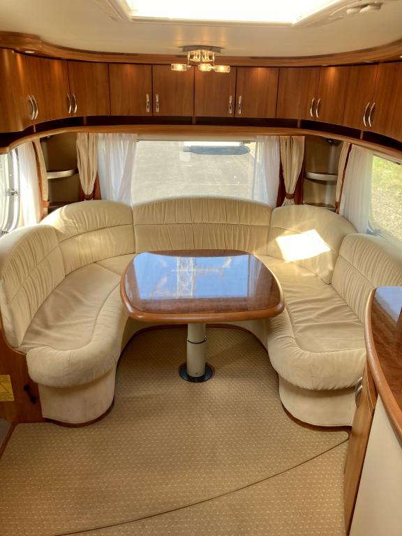Pohjaratkaisussa Takaosassa suuri U -sohvaryhmä. Keskiosassa keittiö sekä paljon kaappitilaa. Etuosassa Pitkittäinen parivuode sekä Wc -& suihkutila.