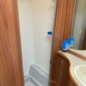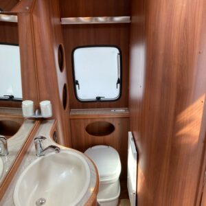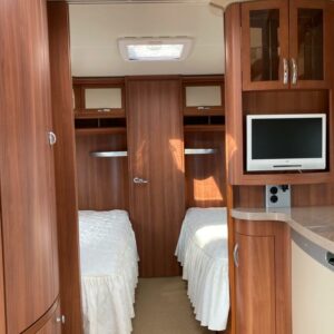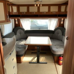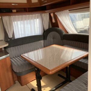 Pohjaratkaisussa edessä tilava U -sohvaryhmä. Keskiosassa keittiö sekä kaappitilaa. Takaosassa erillisvuoteet sekä suuri wc -& suihkutila.