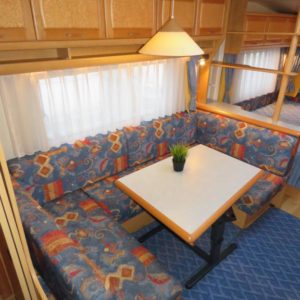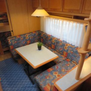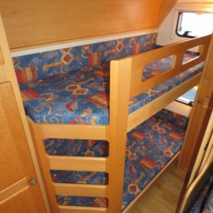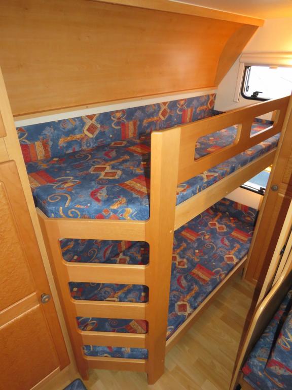 Takana poikittain olevat kerrossängyt, keskellä keittiö ja pöytäryhmä sekä edessä pitkittäinen parivuode ja sen vieressä wc.