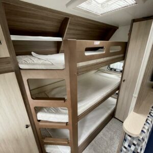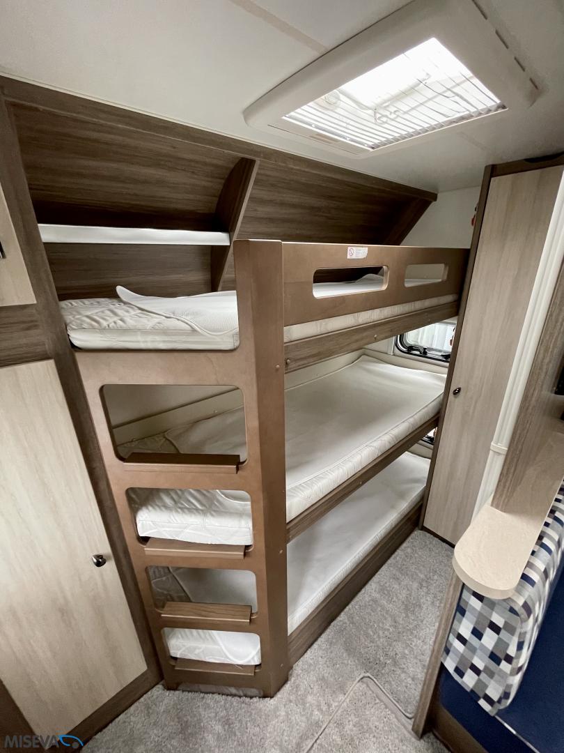 Pohjaratkaisuna takapäässä 3-kerrosvuode, aisanpäässä parivuode ja WC- sekä suihkutila.