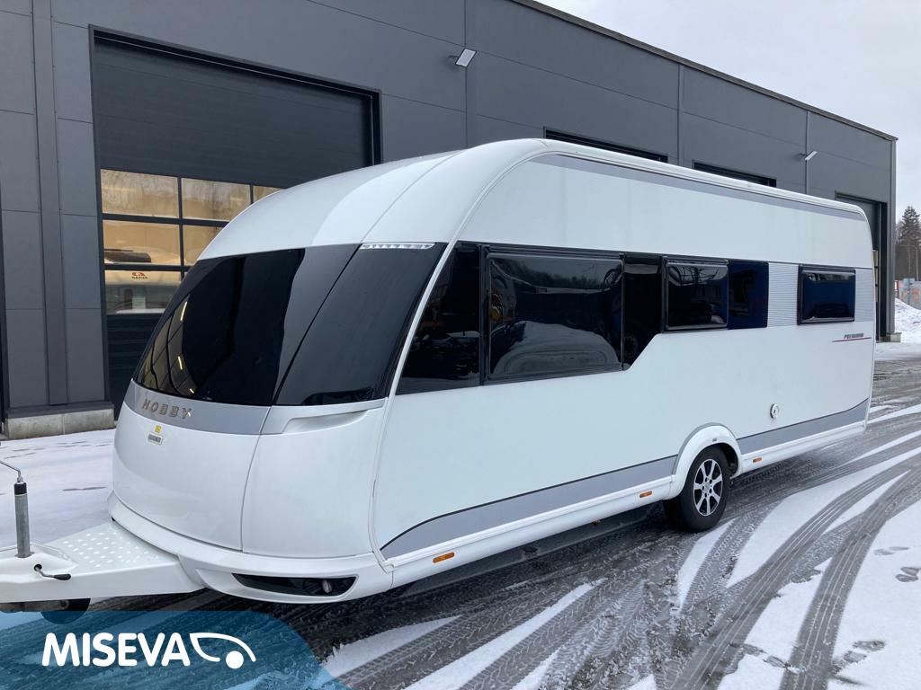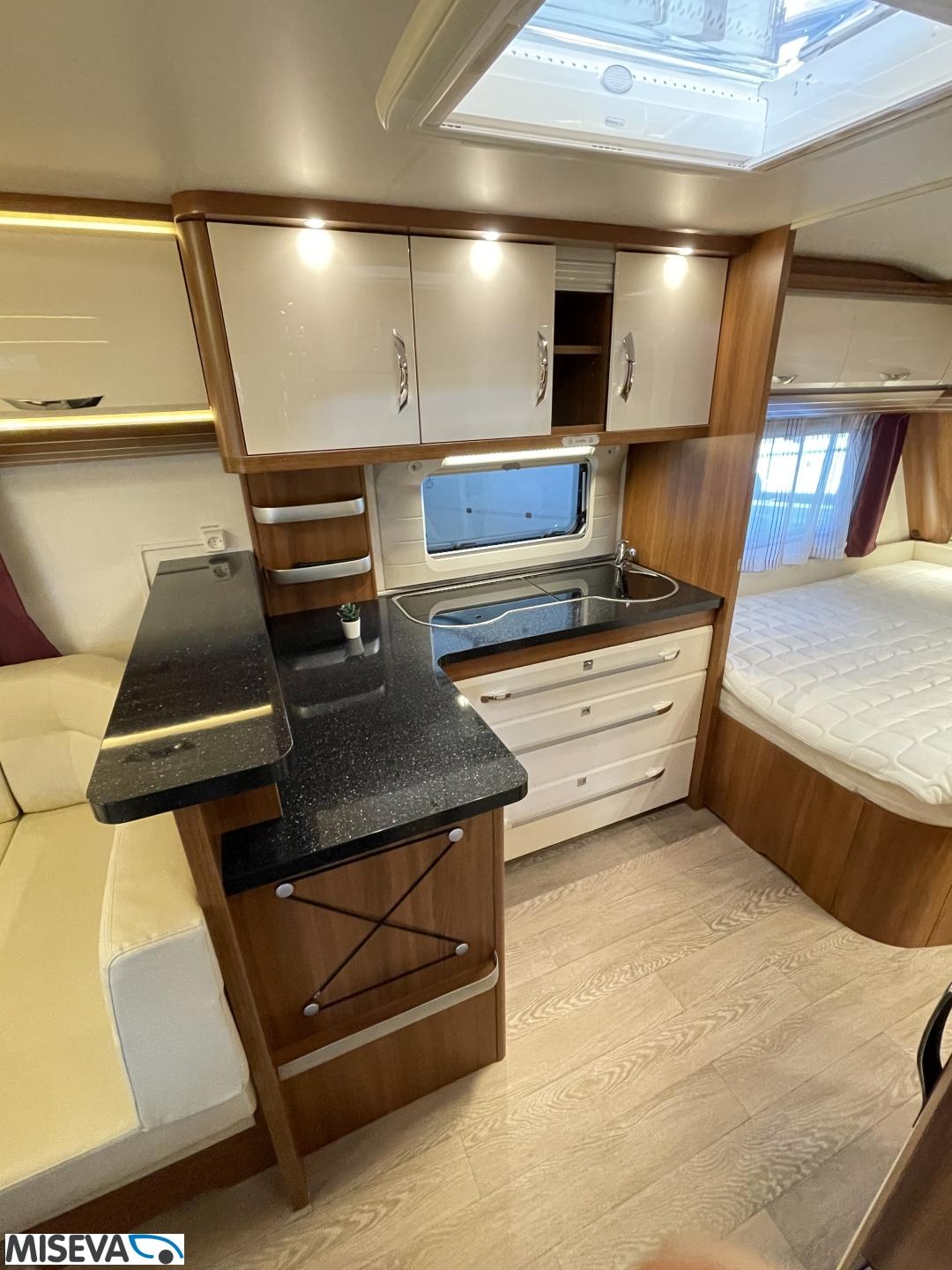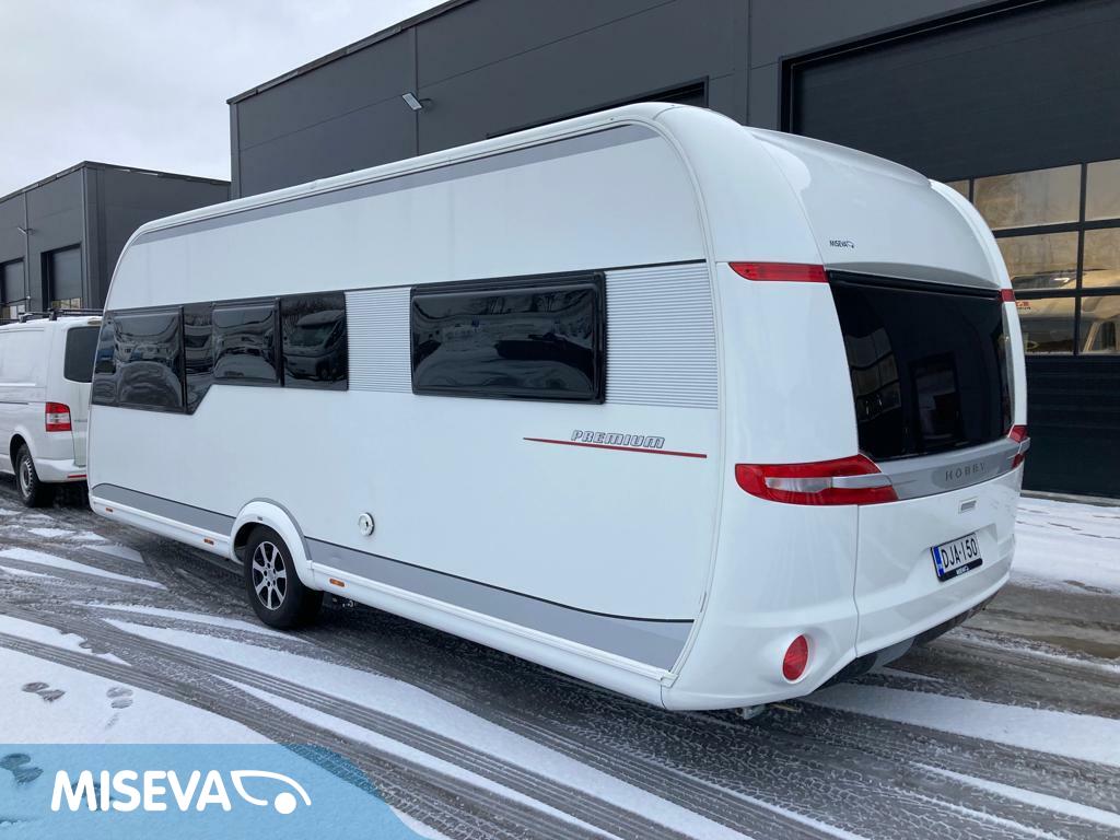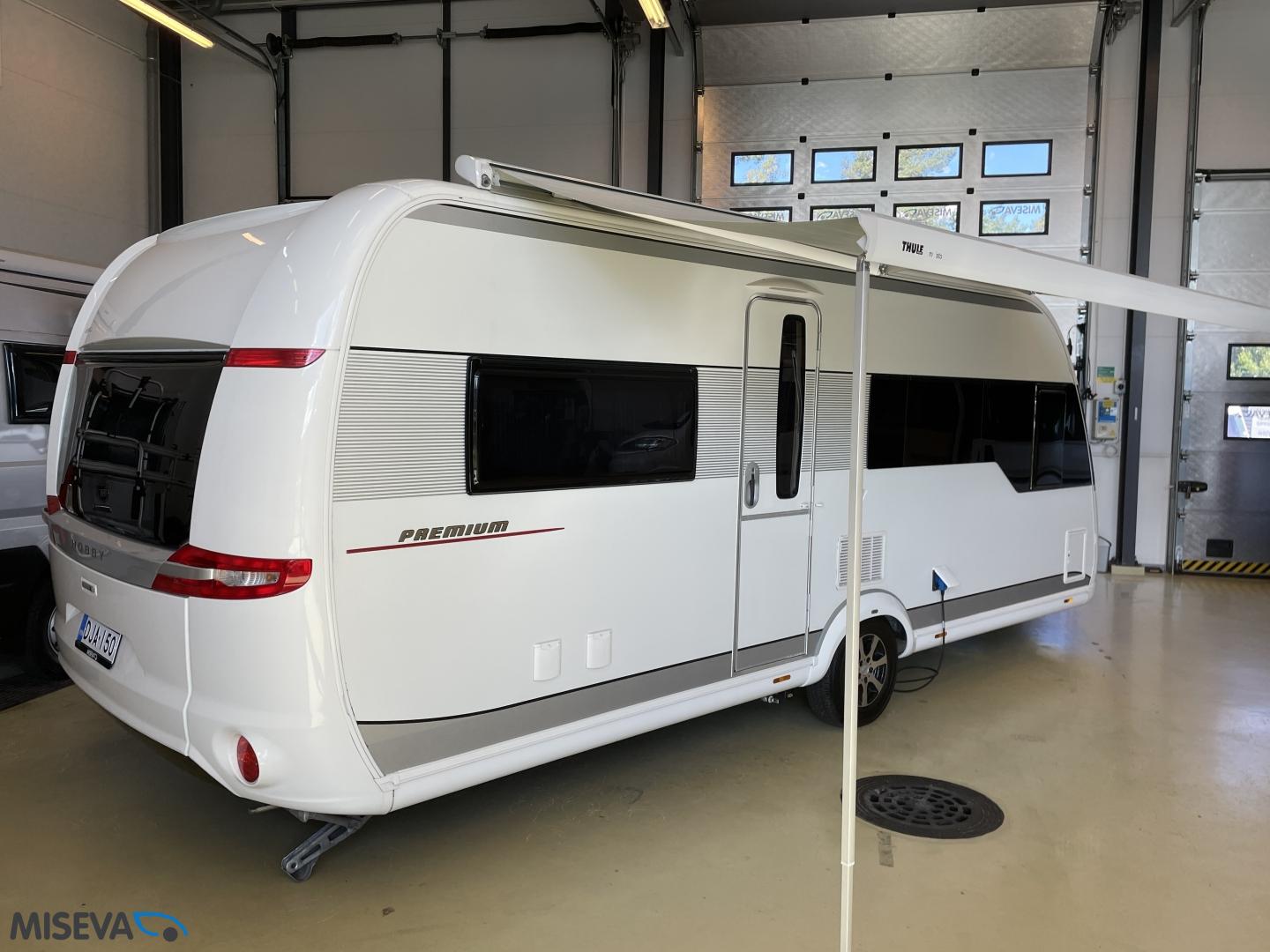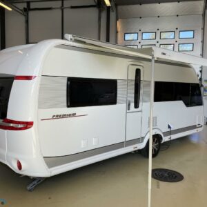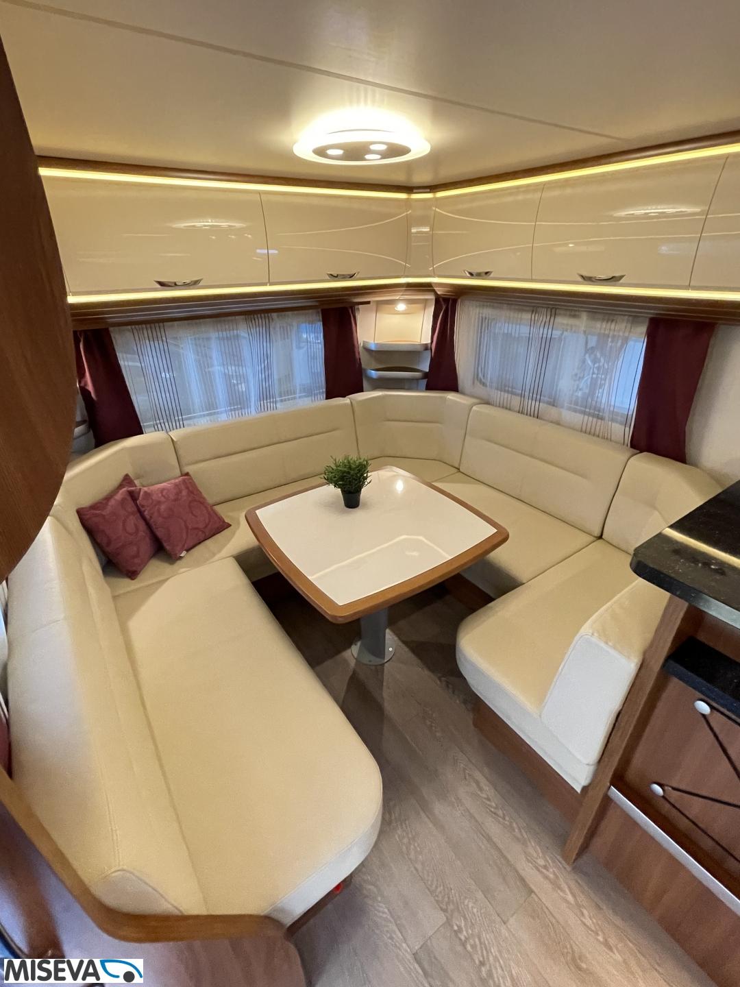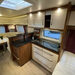 Premium-sarjan suosikkimalli hyvillä varusteilla. Takana U-istuinryhmä keskellä hulppea keittiö isolla jääkaapilla, edessä parivuode ja pesutilat.