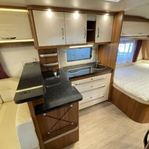 Premium-sarjan suosikkimalli hyvillä varusteilla. Takana U-istuinryhmä keskellä hulppea keittiö isolla jääkaapilla, edessä parivuode ja pesutilat.