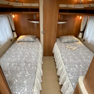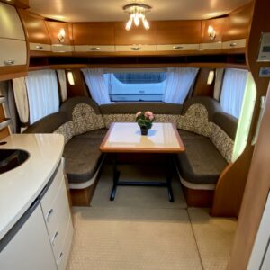 Vaunun etuosasta löytyy valoisa ja viihtyisä U-sohvalla varustettu pöytäryhmä. Keskeltä löytyy keittiön lisäksi paljon kaappitilaa säilytystä varten. Takaosasta löytyy ylivoimaisesti suosituin sänkyvaihtoehto eli erillissängyt! Näiden sänkyjen välistä pääsee näppärästi todella tilavaan pesutilaan, joka jakautuu kätevästi omaan suihku- ja WC-nurkkaukseen.