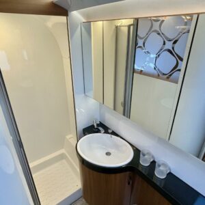 Takaosassa on muhkean parivuoteen lisäksi koko vaunun levyinen pesuhuone/ WC erillisellä suihkunurkkauksella.