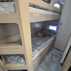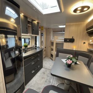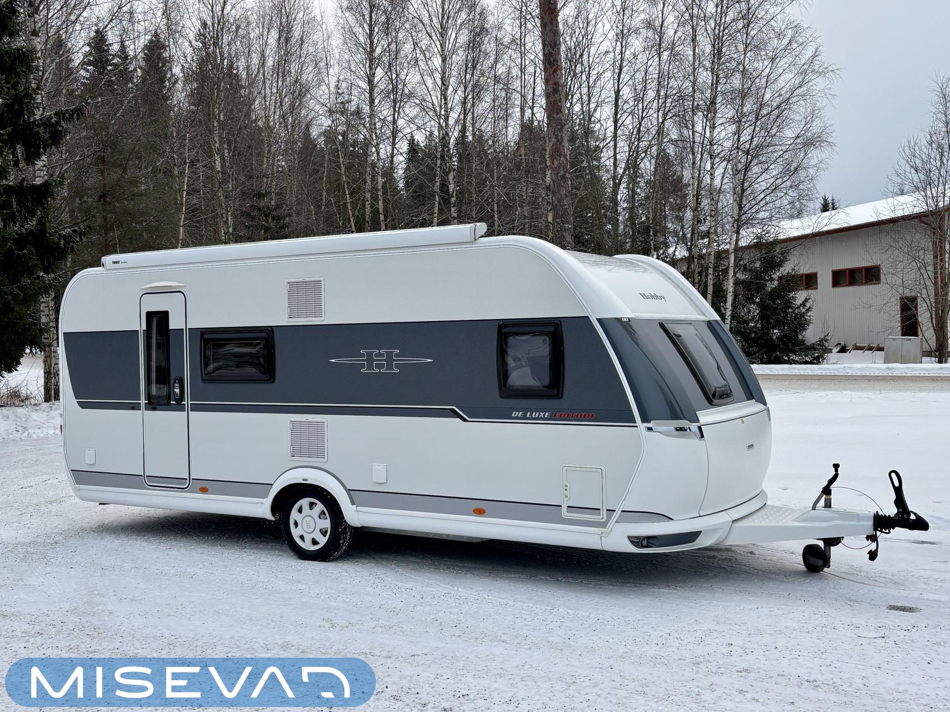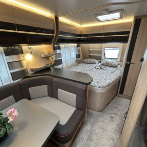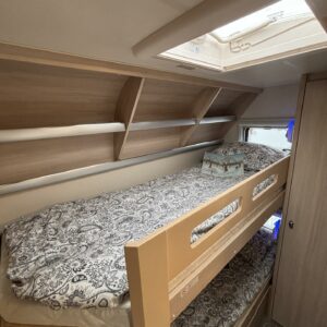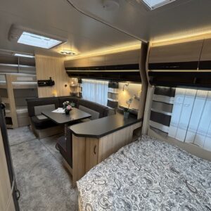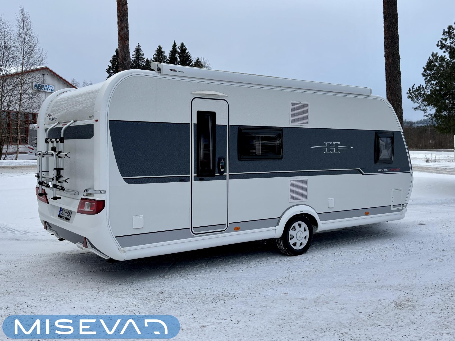 Toiselta käyttäjäomistajalta hieno perhevaunu hyvin varusteltuna. Tässä on oikea namipala tarjolla seuraavalle karavaanariperheelle. Vaunun etuosaan on sijoiteltu aikuisten makuuhuone, sekä WC/kylpyhuonetilat. Parivuoteen alta löytyy runsaasti säilytystiloja tavaroille. ” Makkarin” saa rauhoitettua omaksi tilaksi haitarioven avulla. Parivuoteen ja U-ryhmän väliin jaa baaritaso mikä toimii erinomaisesti myös keittiön aputasona. Poikittain sijoitetusta U-ryhmästä voidaan sijata tarvittaessa vuode kahdelle henkilölle. Jääkaappi on Slimtower mallia eli lähes koko vaunun korkuinen ja tännehän sitten mahtuu evästä mukaan vähintäänkin riittävästi. Takaosa on lasten valtakuntaa. Sieltä löytyy poikittaiset kerrosvuoteet ja molemmille majoittujille on iiiiihaaanat nalle teemaiset yövalaisimet. Alemman kerrosvuoteen saa nostettua ylös ja sieltä löytyy sitten lisää säilytystiloja. Lastenhuoneessa on myös kaksi vaatekaappia. Ja tämäkin vaunun osa saadaan eroteltua omaksi osaksi haitarioven avulla. Ja ei ole vaaraa, että perheen tarvitsee palella kovemmallakaan pakkasella, sillä koko komeus pysyy tasaisen lämpöisenä tehokkaan Alden nestekeskuslämmityksen avulla. Kotelomarkiisi tuo suojaa sateelta ja auringolta. Vanunsiirtolaite säästää selkää ja auton takapuskuria, kun vaunun voi siirrellä langattomalla kauko-ohjaimella millin tarkasti suoraan koukkuun kiinni. Pari polkupyörääkin matkaa mukana reissussa takaseinälle sijoitetussa pyörätelineessä. On hieno vaunu kaikin puolin, eli varmasti tutustumisen arvoinen tapaus.