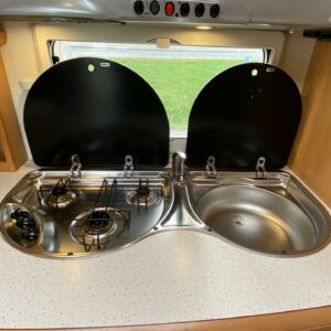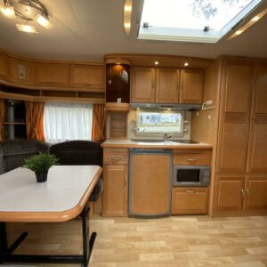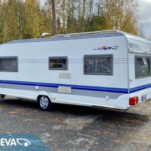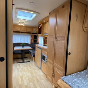 Vaunun etuosassa on erillisvuoteet. Keskeltä vaunua löytyy kattavasti varusteltu keittiö, sekä wc. Vaunun peräpäässä on pöytäryhmä.