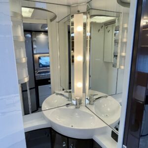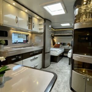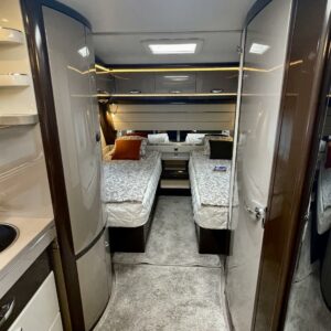 Vaunun etuosassa on muhkeat erillisvuoteet, jotka on mahdollista yhdistää yhdeksi superleveäksi parisängyksi.