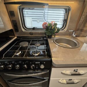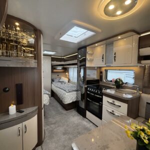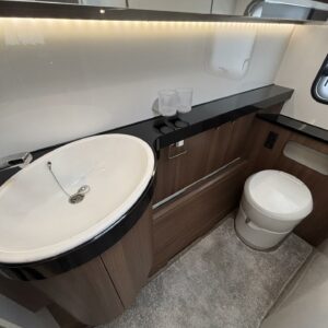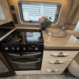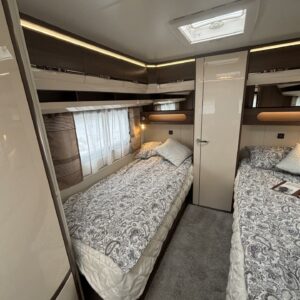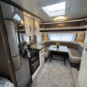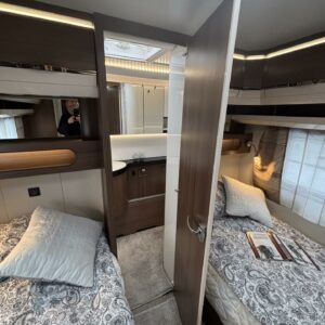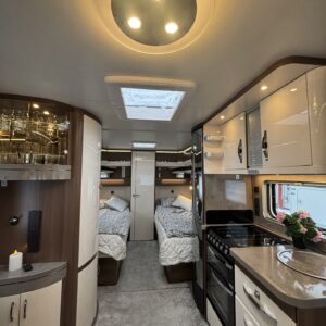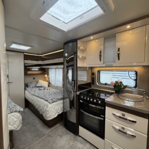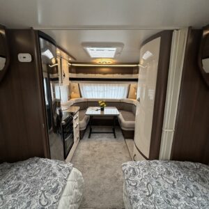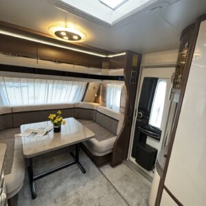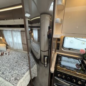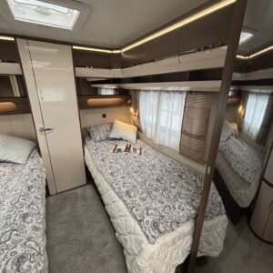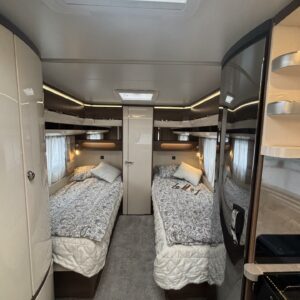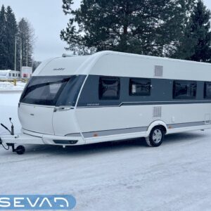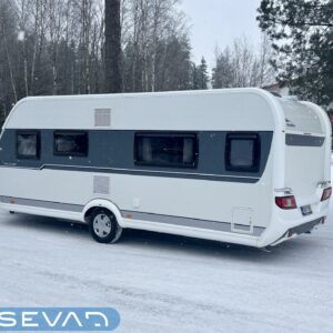 Nyt on kyllä sellaista helmeä tarjolla, että kestää kriittisemmänkin tarkastelijan tutkiskelun. Vaunulla ollu kaksi käyttäjäomistajaa ja on sitten ollut huolellisessa käytössä tämä yksilö. Vaunun takaosa on kokonaisuudessaan WC/kylppäritiloja erillisellä suihkutilalla. Sitten tulee makkari missä on pitkittäiset erillisvuoteet. Molempien vuoteiden alle jää runsaat säilytystilat. Etuosa on tupakeittiömallinen, eli edessä oleva U-ryhmä on keittiön kanssa yhtä melkoisen avaraakin tilaa. U-ryhmästä saadaan tarvittaessa vuode kahdelle henkilölle. Keittiössä varusteina mm. kaasu-uuni grillillä ja lähes koko vaunun korkuinen jääkaappi. Makkarin ja keittiön saa tarvittaessa eroteltua haitariovella. Lämmityksestä vastaa Alde, eli pirtissä lämpö riittää tiukemmassakin pakkasessa. Mukavuusvarusteena lisäksi sähköinen lattianlämmitys. Aldessa tietysti tutut herkut, eli sähkövastukset ja lämminvesiboileri. Valmiiksi asennettuina varusteina mm. kotelomarkiisi, kaasun ulosotto, automaattinen kaasupullon vaihtaja, sekä hyönteisovi. Tule ihmeessä tutustumaan tai pyydä vaikka Whatsapilla videoesittely vaunusta, niin näette, että kunto on kehumisen arvoinen.