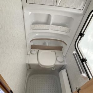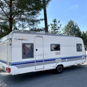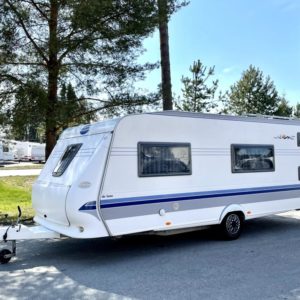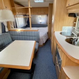 Makuupaikat jopa kuudelle hengelle. Vaunussa takaosassa kerrosvuoteet, keskiosassa tilava sohvaryhmä laskettavalla pöydällä ja keittiö, jossa liesi, mikro sekä jääkaappi pakastinlokerolla. Etuosassa parivuode sekä Wc & suihku-tila.