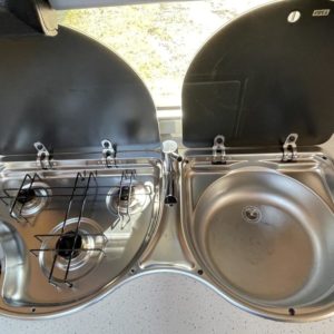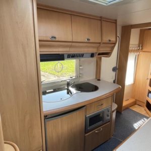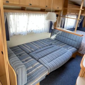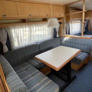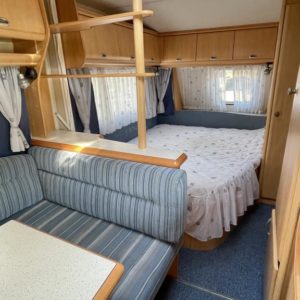 Makuupaikat jopa kuudelle hengelle. Vaunussa takaosassa kerrosvuoteet, keskiosassa tilava sohvaryhmä laskettavalla pöydällä ja keittiö, jossa liesi, mikro sekä jääkaappi pakastinlokerolla. Etuosassa parivuode sekä Wc & suihku-tila.