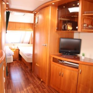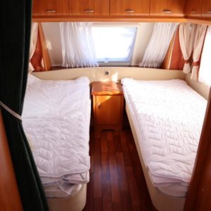 jonka jatkeena pesuhuone, edessä leveät erillisvuoteet joustinpatjoilla. Varusteissa mm kwh-