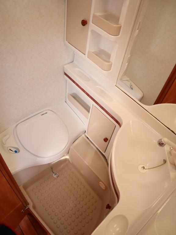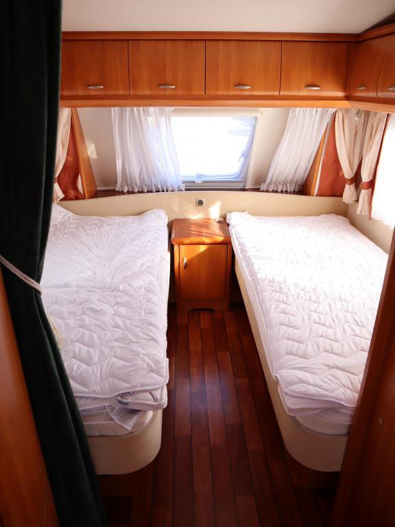 jonka jatkeena pesuhuone, edessä leveät erillisvuoteet joustinpatjoilla. Varusteissa mm kwh-