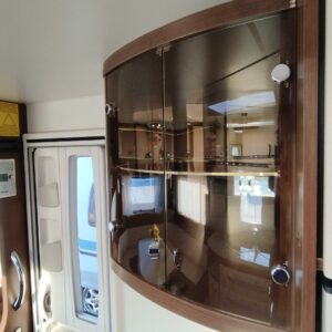 Vaunun etuosassa on suuri istuinryhmä ja runsaasti kaappi- ja hyllytilaa. Valaistus on toteutettu tyylikkäästi sekä tehokkailla kattospoteilla, että tunnelmallisemmilla nurkkaan sijoitetuilla lampuilla.