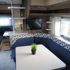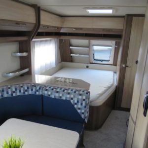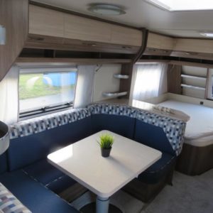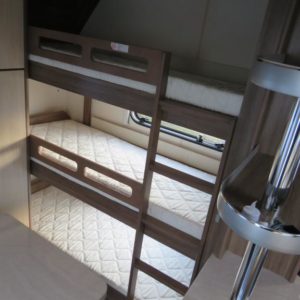 3-kerrosvuoteet. Todellinen lapsiperheen vaunu vuoteet jopa 8:lle! Edessä parivuode ja pesuosasto, keskellä U-istuinryhmä ja tilava keittiö, takana lastenhuone kerrosvuoteilla ja istuinryhmällä.