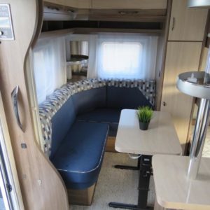 3-kerrosvuoteet. Todellinen lapsiperheen vaunu vuoteet jopa 8:lle! Edessä parivuode ja pesuosasto, keskellä U-istuinryhmä ja tilava keittiö, takana lastenhuone kerrosvuoteilla ja istuinryhmällä.