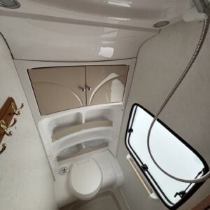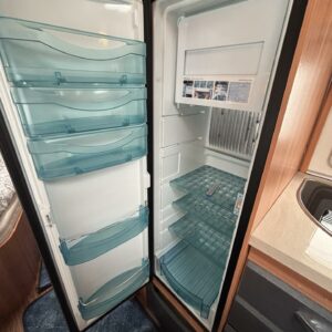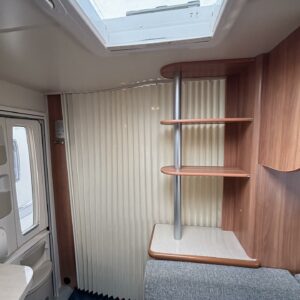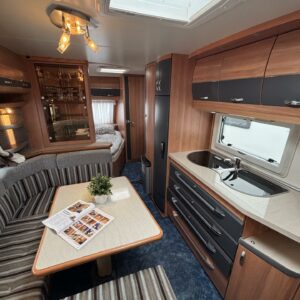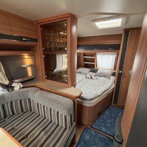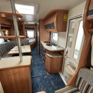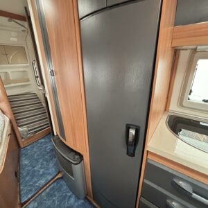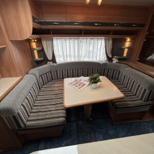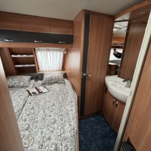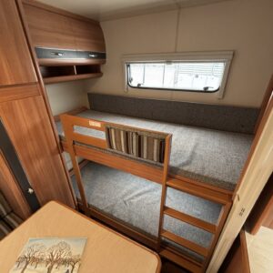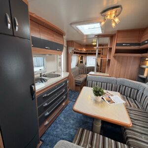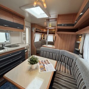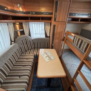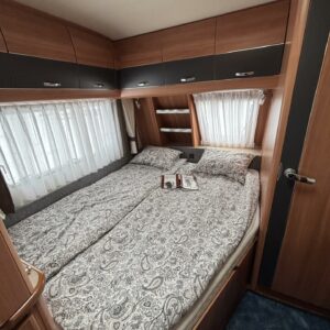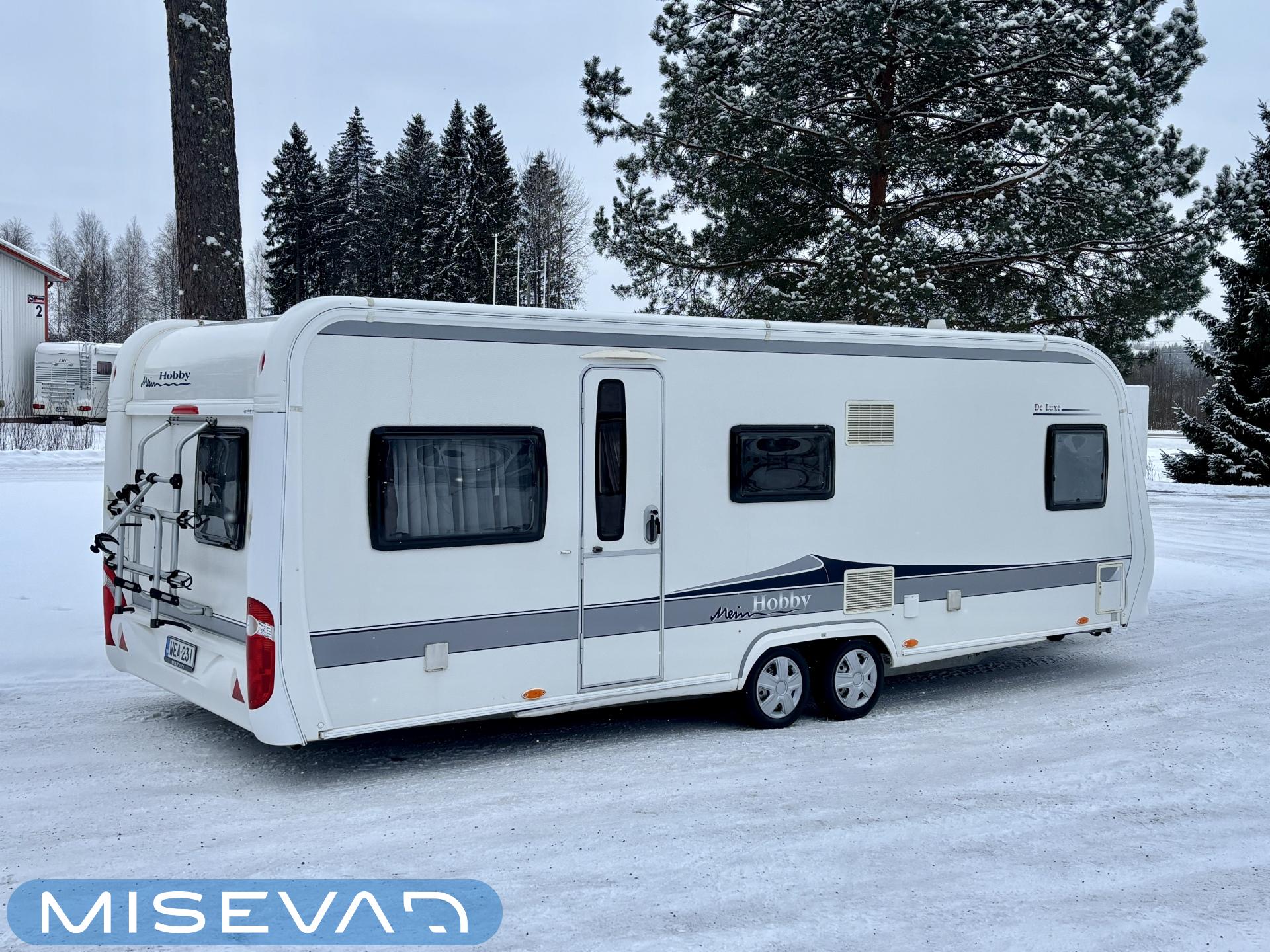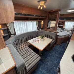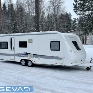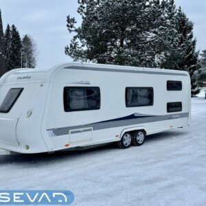 Perhemallin Hobby niin sanottuna lastenhuone versiona. Vaunun takaosaan on sijoitettu pitkittäiset kerrosvuoteet, sekä kulmasohva ja alas laskettava pöytä. Tänne majoittelee hienosti ainakin 3 juniorikaravaanaria. Tämän osaston saa myös suljettua omaksi sopeksi välioven avulla. Keskellä vanua on keittiö, sekä U-ryhmä ruokailu/seurustelutoimintoja varten. Tähänkin saa sijattua yhden vuoteen tarpeen tullen. Keittiössä on mukavasti säilytystiloja isoissa vetolaatikoissa. Laskutilaa on lisänä sohvaryhmän molempien reunojen aputasoilla. Ja koska iso vaunu ja paljon asukkaita, niin jääkaappi on myös mitoitettu sen mukaisesti ihan reilun kokoiseksi. Etuosassa on pitkittäinen parivuode ja WC/kylpyhuonetilat. Ihan nätti vaunu ja etenkin sisätiloiltaan oikeinkin siistissä kunnossa.