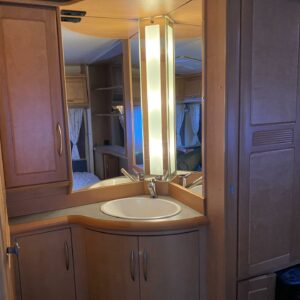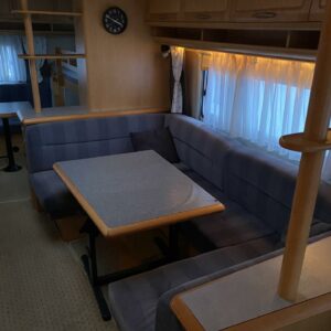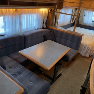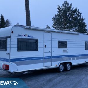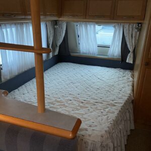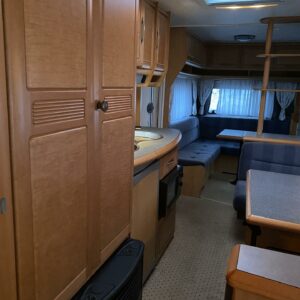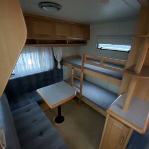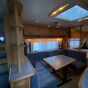 Vaunun etuosassa pitkittäinen parivuode ja wc tilat. Keskiosassa keittiö ja tilava U-ryhmä josta muokattavissa vuode. Takaosassa L-mallin sohva ja kerrosvuoteet.