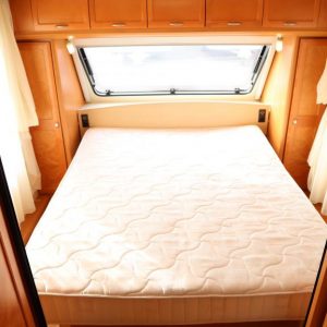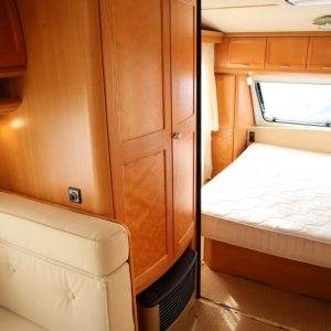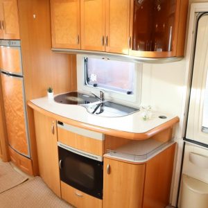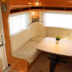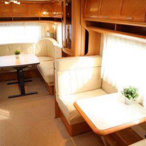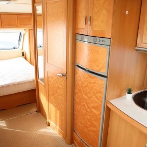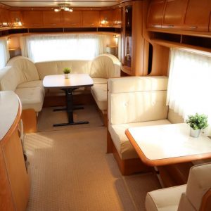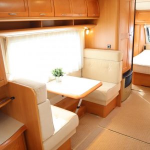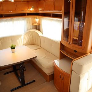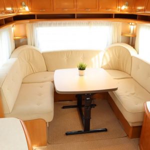 Vaunu missä reilusti tilaa. Takana U-istuinryhmä,keskellä toinen pienempi pöytäryhmä, vastapäätä tätä keittiö isolla jääkaapilla, Vaatekaapit ja keulassa keskellä parivuode ( saarekevuode ).