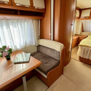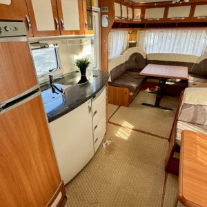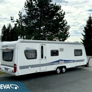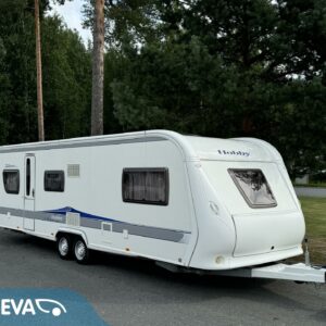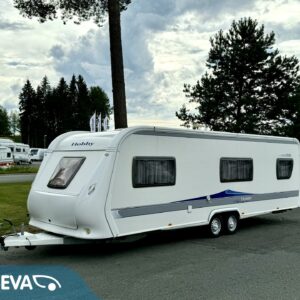 Mukavat tilat tarjoava Hobbyn teliakselinen matkailuvaunu. Vaunun etuosaan on sijoitettu makuuhuone pitkittäisellä parivuoteella. Tämä tila saadaan ”rauhoitettua” omaksi tilakseen välioven avulla. Heti makuuhuoneen vieressä on WC/kylpyhuonetilat, sekä säilytystiloja. Keskeltä vaunua löytyy keittiö normaalilla matkailuvaunun keittiövarustuksella. Jääkaappi on tilava ja siinä on erillinen pakastinlokero. Keskeltä löytyy myös vastakkain istuttava pöytäryhmä mistä saadaan tarvittaessa sijattua vuode yhdelle henkilölle. Vaunun takaosa on pyhitetty runsaan kokoiselle U-ryhmälle ja tämähän taipuu tarvittaessa vuoteeksi kahdelle henkilölle. Lämmitysjärjestelmänä on Alden nestekeskuslämmitys ja tietysti sähkövastuksilla (sähköpatruuna) varustettuna. Mukavuusvarusteena on vielä sähköinen lattianlämmitys. Tarkastettu, hiljattain katsastettu vaunu valmiina uusiin seikkailuihin.