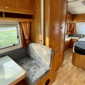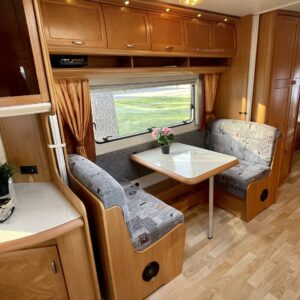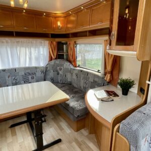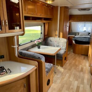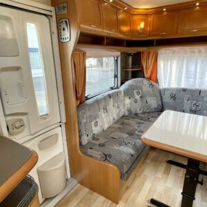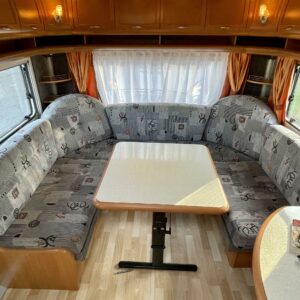 Vaunun perässä on iso U- pöytäryhmä. Molemmat pöytäryhmät on tarpeen vaatiessa sijattavissa lisävuoteiksi.
