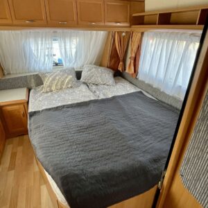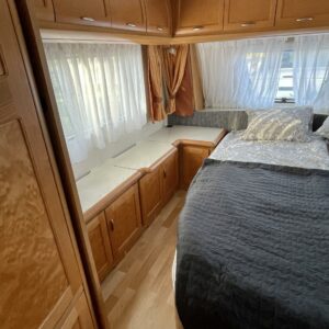 Vaunun etuosassa on leveä parivuode ja runsaasti kaappitilaa.