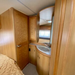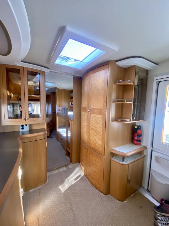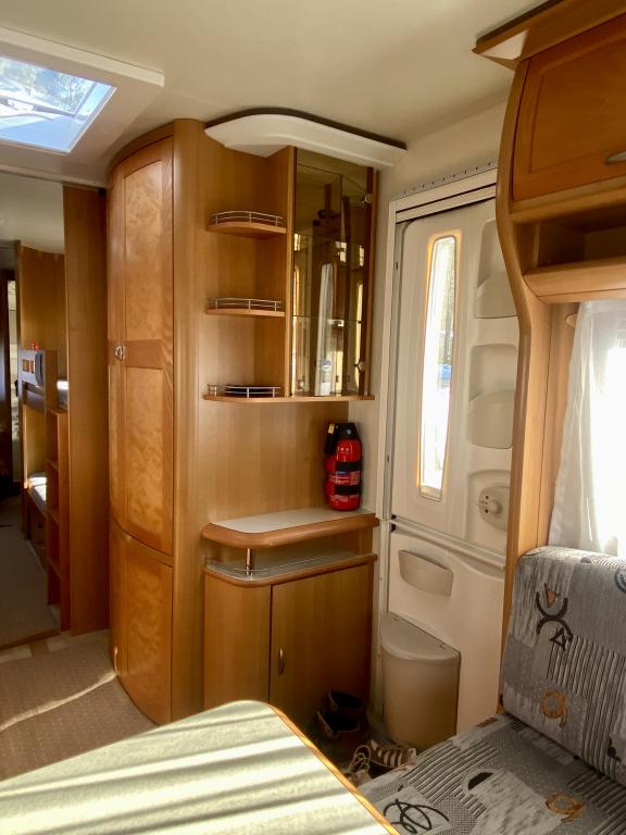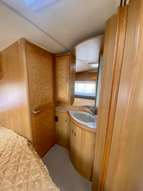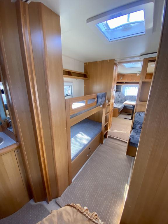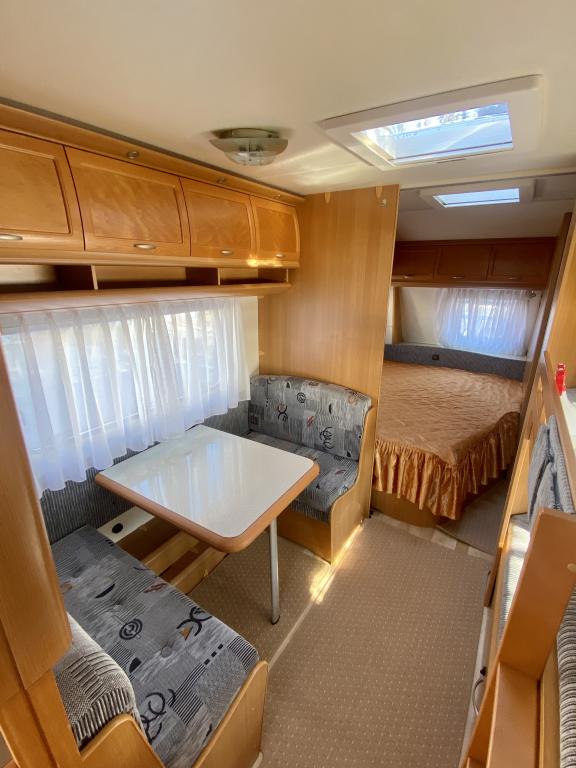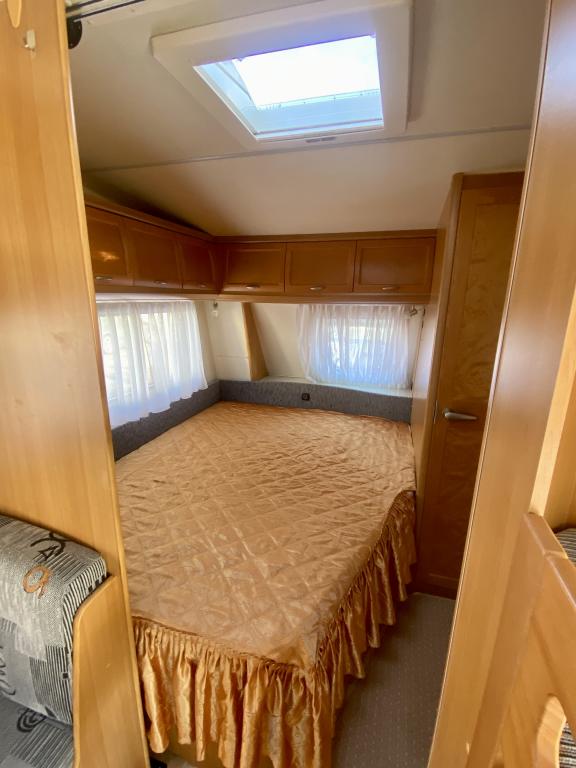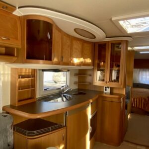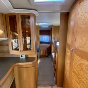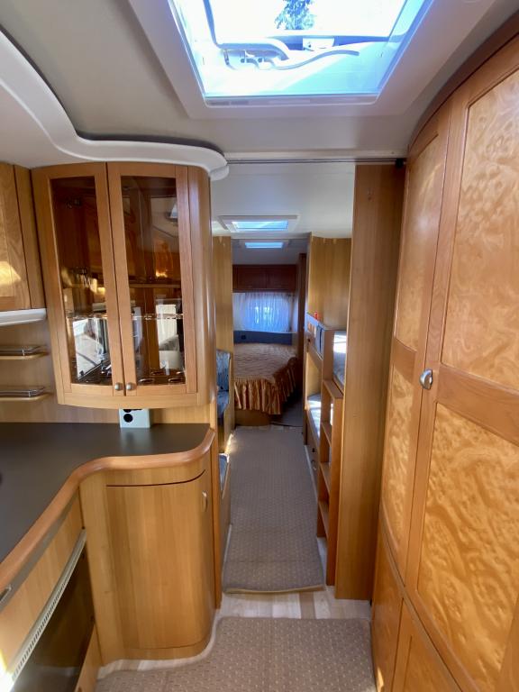Pohjaratkaisussa edessä pitkittäinen parivuode ja WC-tilat. Keskellä kerrosvuoteet, sekä pienempi pöytäryhmä, mikä sijattavissa vuoteeksi. Avara keittiö missä normaalin keittiövarustuksen lisäksi kaasu-uuni. Hyvin kaappitilaa tavaroiden säilyttämistä varten. iso U-ryhmä mikä muutettavissa parivuoteeksi.