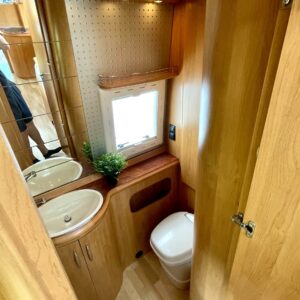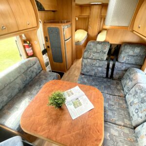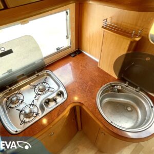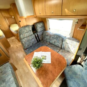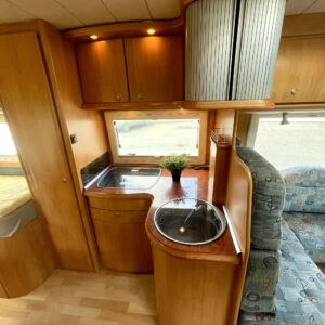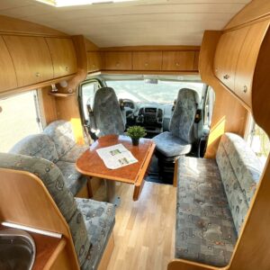 Auton etuosasta löytyy iso L- sohvaryhmä sivusohvalla. Keskellä autoa on keittiö jonka varustukseen kuuluu muunmuassa iso jääkaappi-pakastin. Auton takaosassa pitkittäiset erillisvuoteet ja koko auton levyinen pesuhuone/ WC erillisellä suihkunurkkauksella.