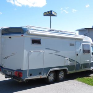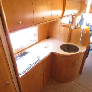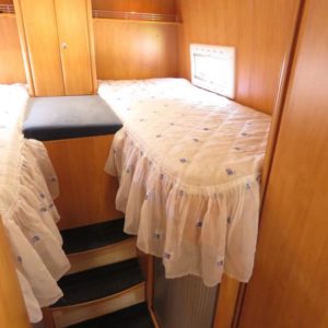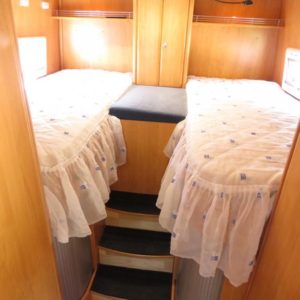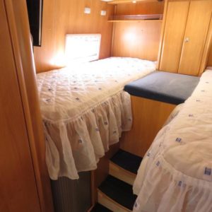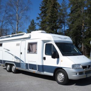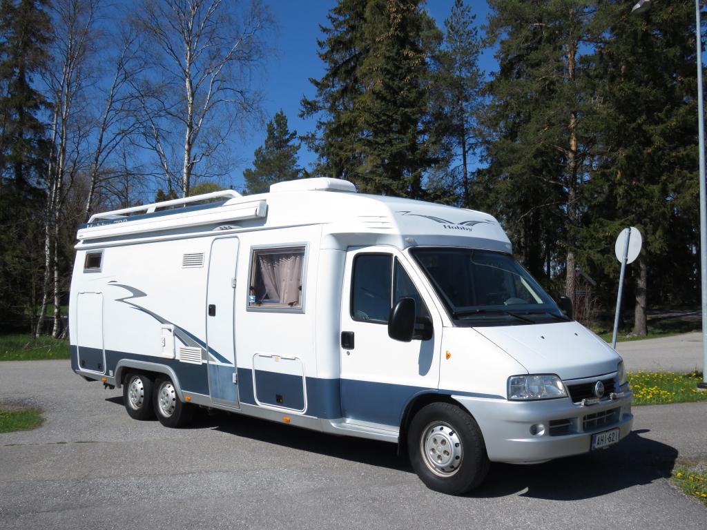 3 – Akselinen Hobby erillisvuoteilla. Pitkässä autossa on reilusti tilaa. Edessä tilava istuinryhmä isolla pöydällä ja sivusohvalla. Keskellä keittiö korkealla jääkaapilla, takana hyvät erilliset vuoteet mihin käynti onnistuu helposti. Auto on rekisteröity jopa 8:lle henkilölle.