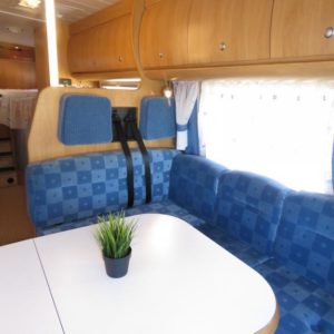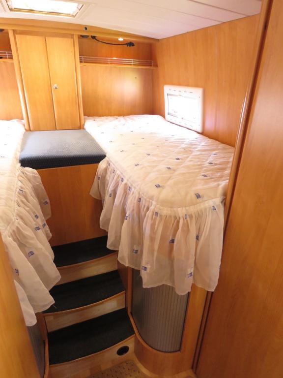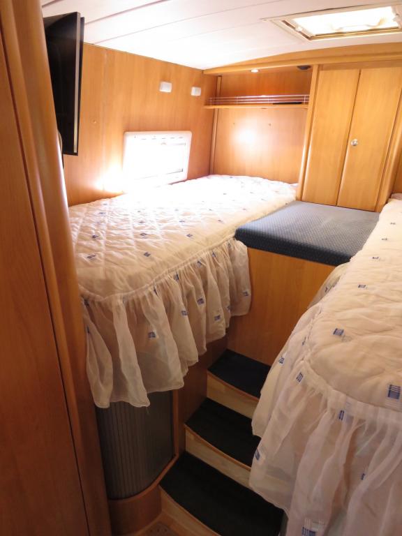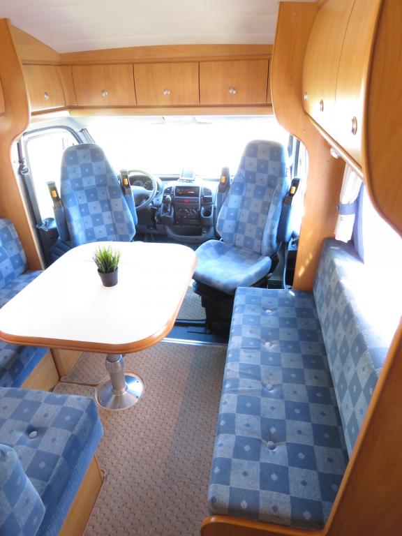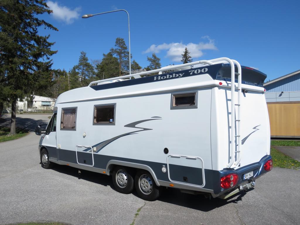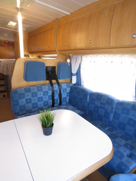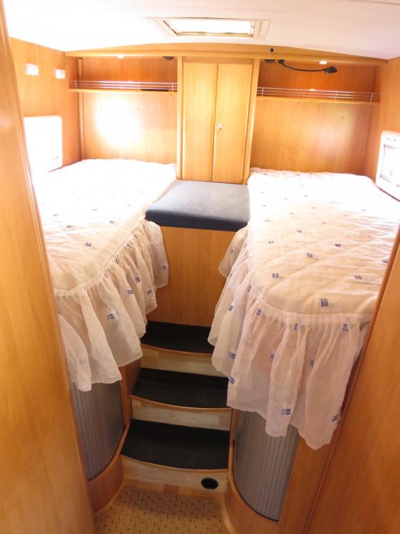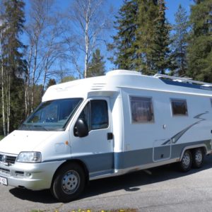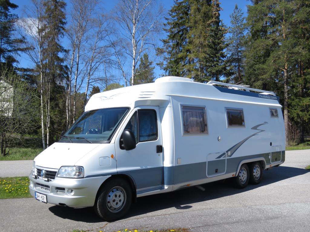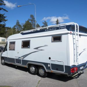 3 – Akselinen Hobby erillisvuoteilla. Pitkässä autossa on reilusti tilaa. Edessä tilava istuinryhmä isolla pöydällä ja sivusohvalla. Keskellä keittiö korkealla jääkaapilla, takana hyvät erilliset vuoteet mihin käynti onnistuu helposti. Auto on rekisteröity jopa 8:lle henkilölle.
