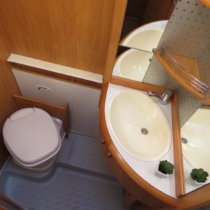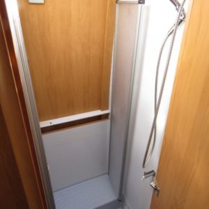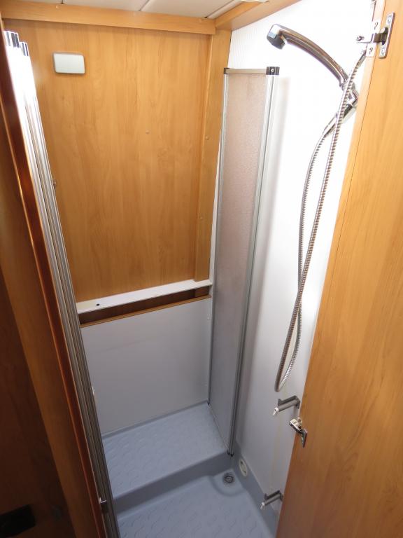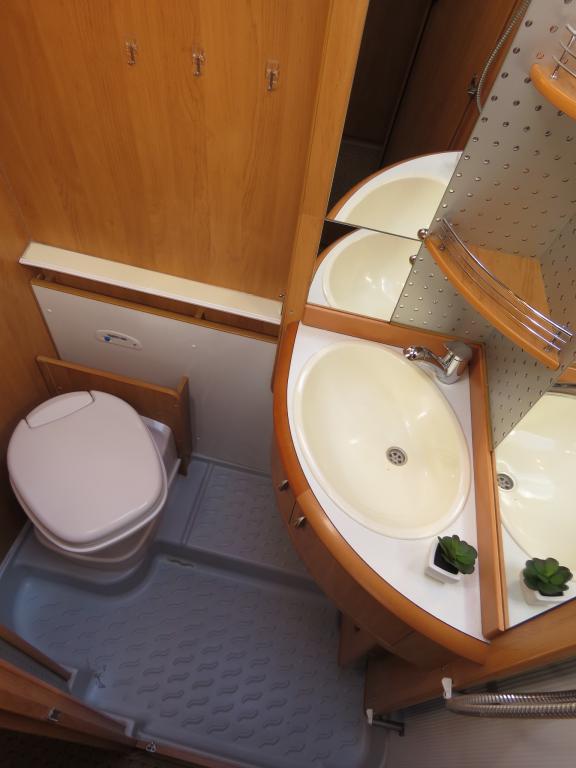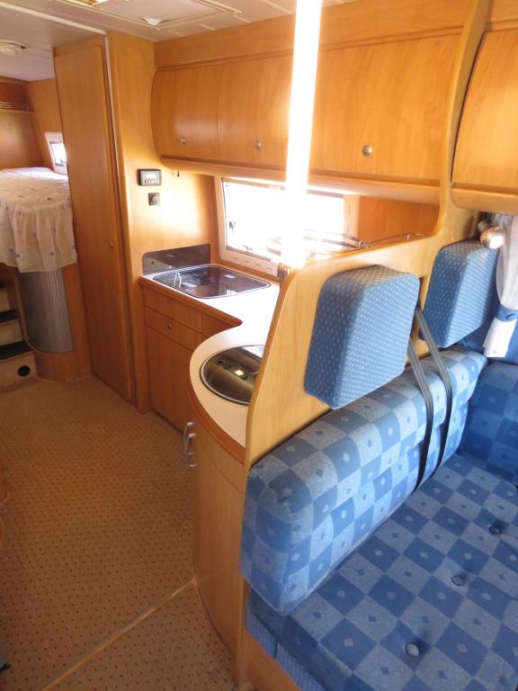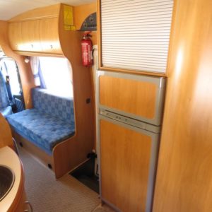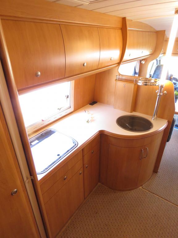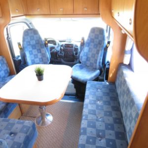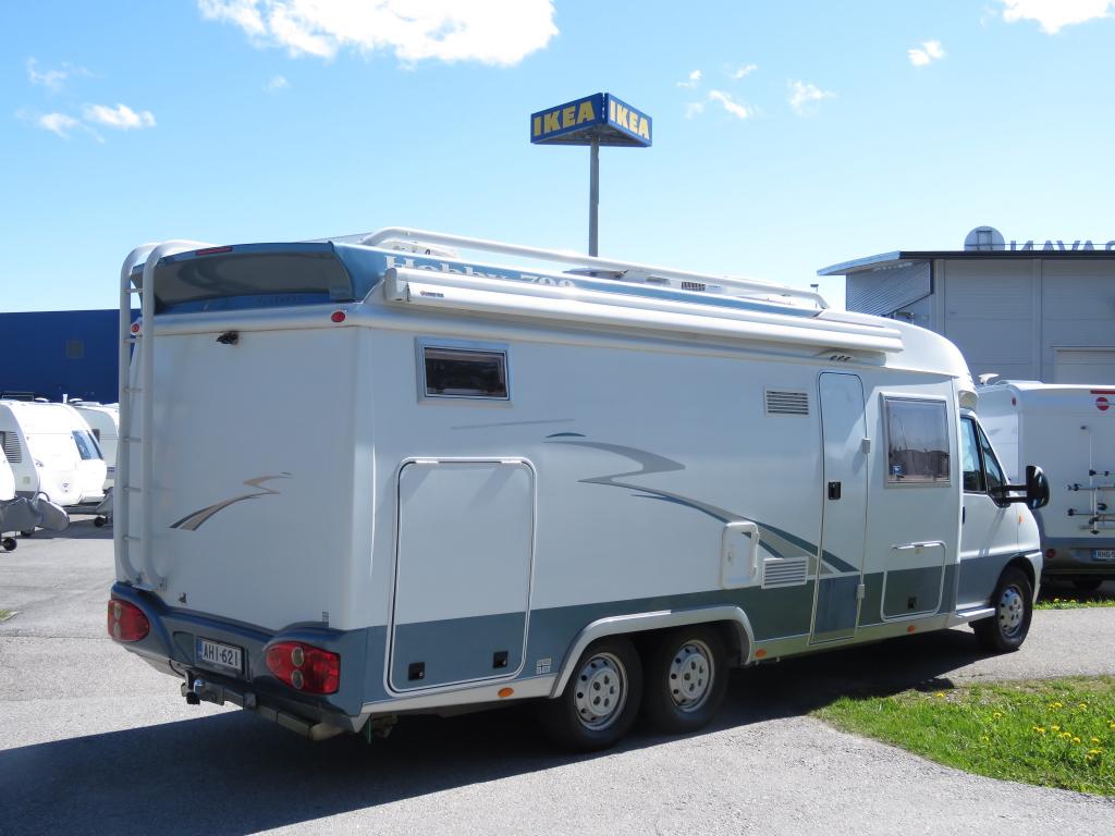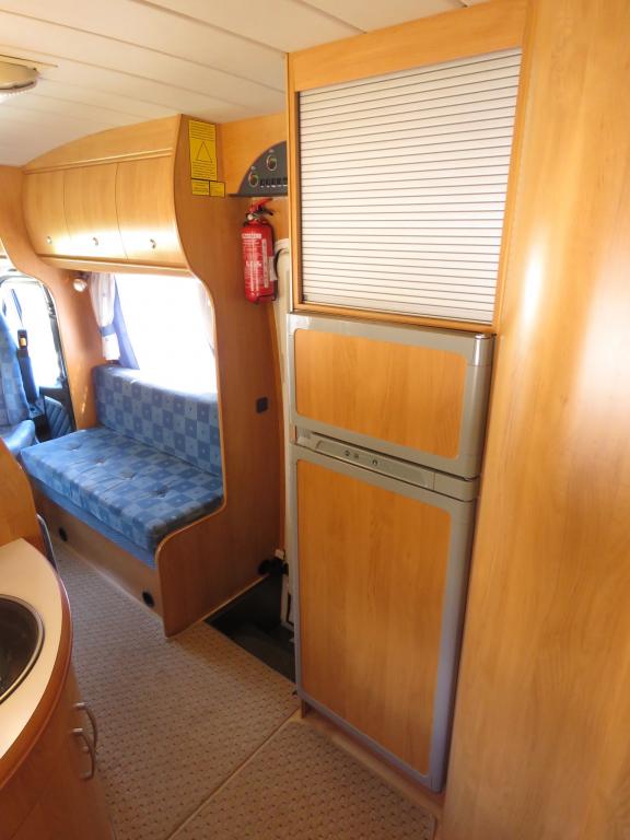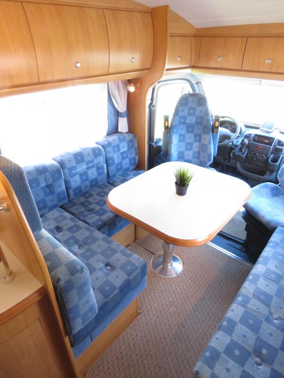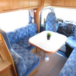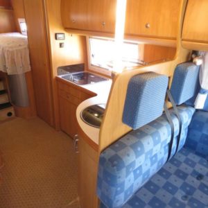 3 – Akselinen Hobby erillisvuoteilla. Pitkässä autossa on reilusti tilaa. Edessä tilava istuinryhmä isolla pöydällä ja sivusohvalla. Keskellä keittiö korkealla jääkaapilla, takana hyvät erilliset vuoteet mihin käynti onnistuu helposti. Auto on rekisteröity jopa 8:lle henkilölle.