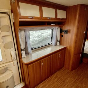 Hulppea kausipaikkavaunu ilmastoinnilla ja erillisvuoteilla. Perällä todella tilava pesuosasto