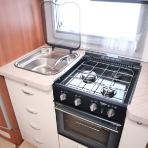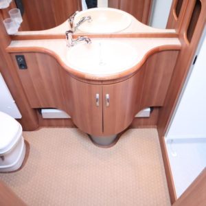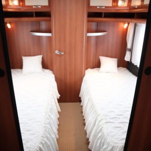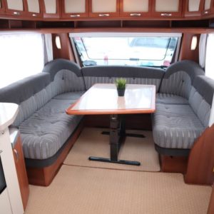 Vaunun takaosassa koko vaunun levyinen pesuhuone/ WC sekä matalat erillisvuoteet. Vaunun keskiosasta löytyy kaasu- uunilla ja korkealla jääkaapilla varustettu keittiö sekä korkeat vaatekaapit. Vaunun edestä löytyy hulppea pöytäryhmä jonka ympärille mahtuu isompikin seurue iltaa istumaan.