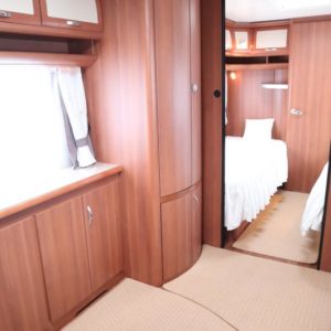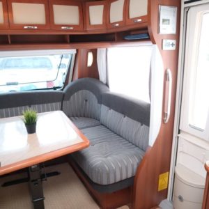 Vaunun takaosassa koko vaunun levyinen pesuhuone/ WC sekä matalat erillisvuoteet. Vaunun keskiosasta löytyy kaasu- uunilla ja korkealla jääkaapilla varustettu keittiö sekä korkeat vaatekaapit. Vaunun edestä löytyy hulppea pöytäryhmä jonka ympärille mahtuu isompikin seurue iltaa istumaan.