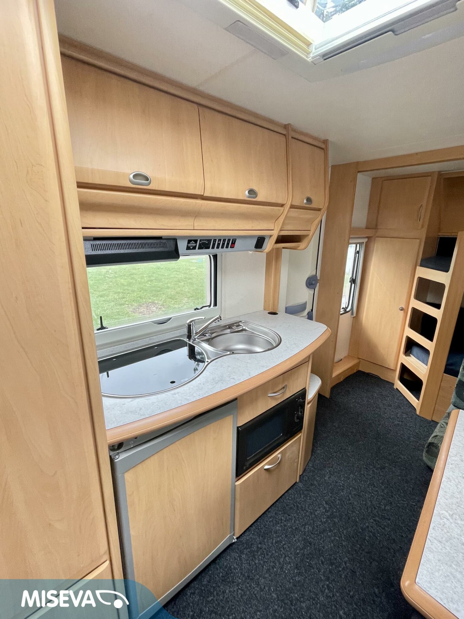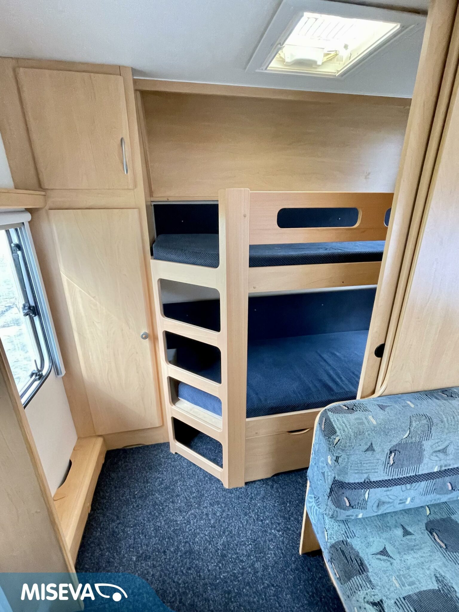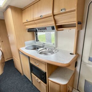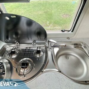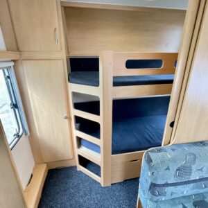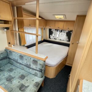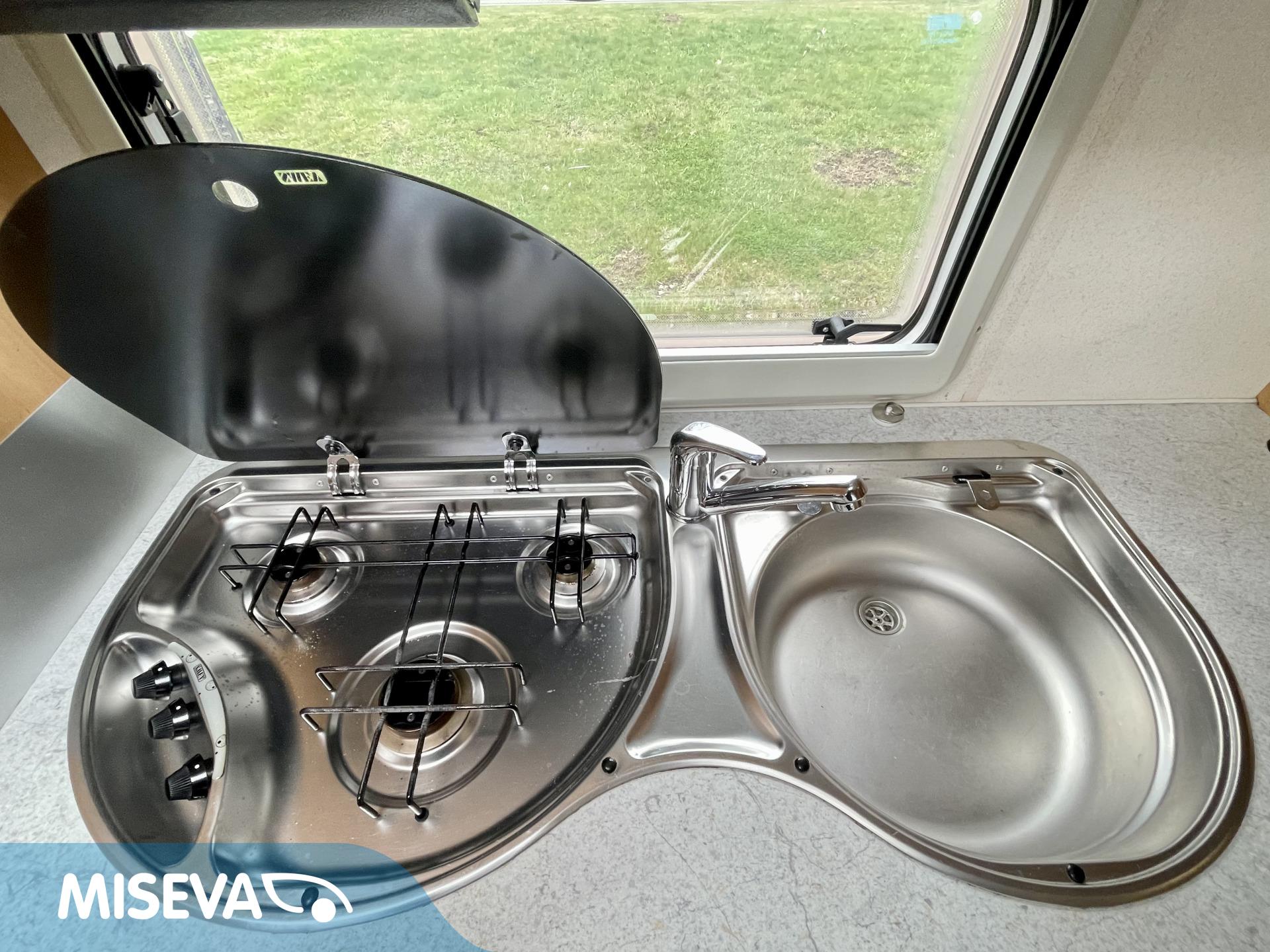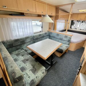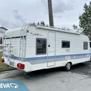 Todellinen perhevankkuri, missä on hyvin tilaa ja paljon makuupaikkoja. Takaosassa olevan kerrosvuodeosaston saa omaksi tilakseen likuoven avulla ja kerrosvuotesiin saa majoitettua kaksi henkilöä. Samoin etuosa saadaan eroteltua omaksi osastokseen haitarioven avulla. Etuosassa sijaitsee pitkittäinen parivuode sekä WC/kylpyhuoneosasto. Keskellä vaunua on todella reilun kokoinen U-ryhmä isommallekin ryhmälle ja tästä voidaan sijata petipaikat kahdelle henkilölle. Keskellä toisella puolella on keittiö matkailuvaunun perusvarustuksella. Lämmitysjärjestelmänä tehokas ja tasaisen lämmön tuottava Alden nestekiertolämmitys. Akku latautuu aurinkoisella ilmalla näppärästi itsekseen aurinkokennojärjestelmän avulla. Pihan puolelle voidaan lisätilaa järjestää pussimarkiisin avustuksella.