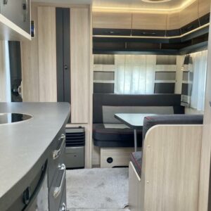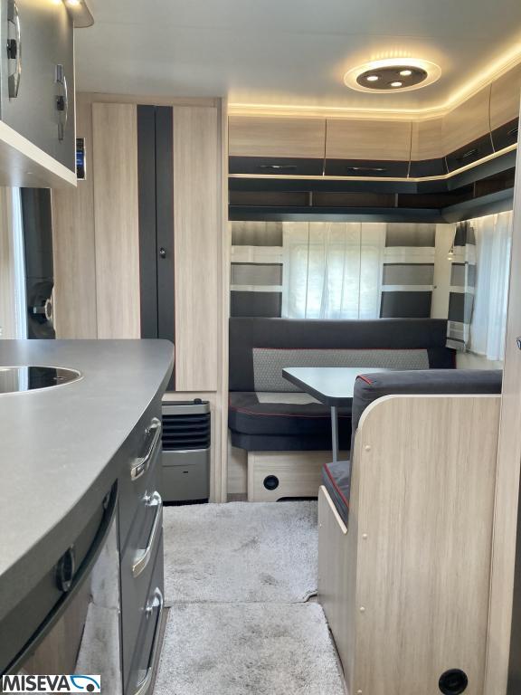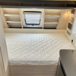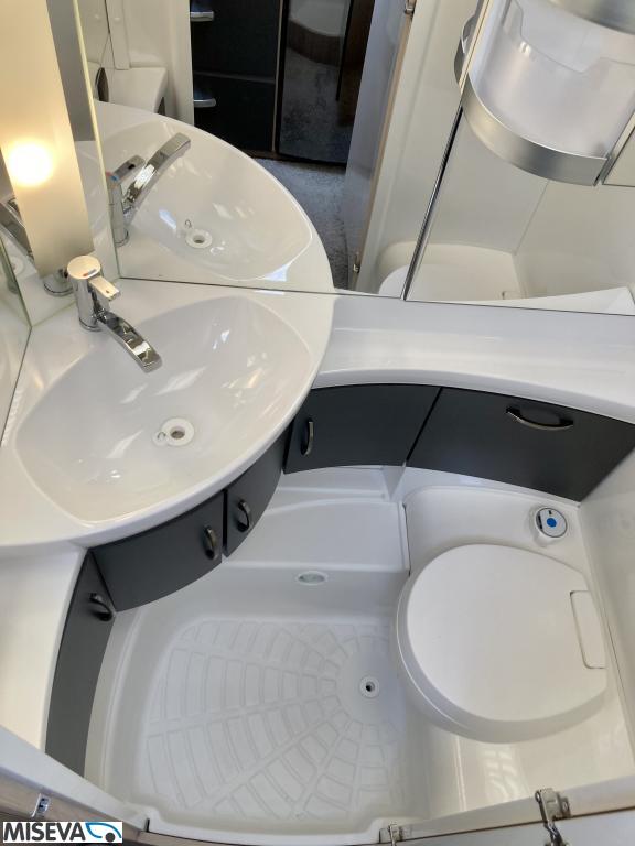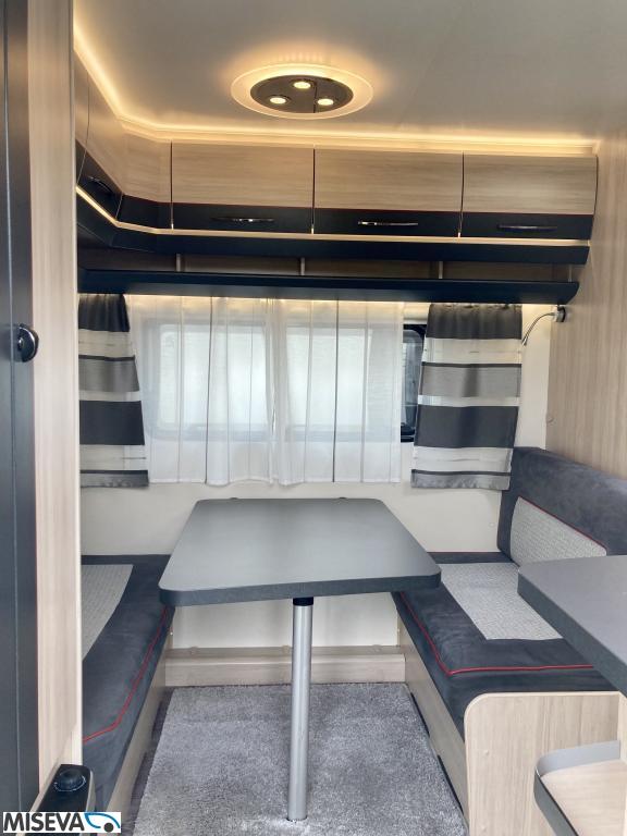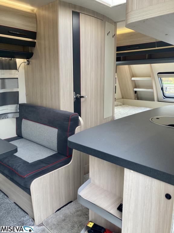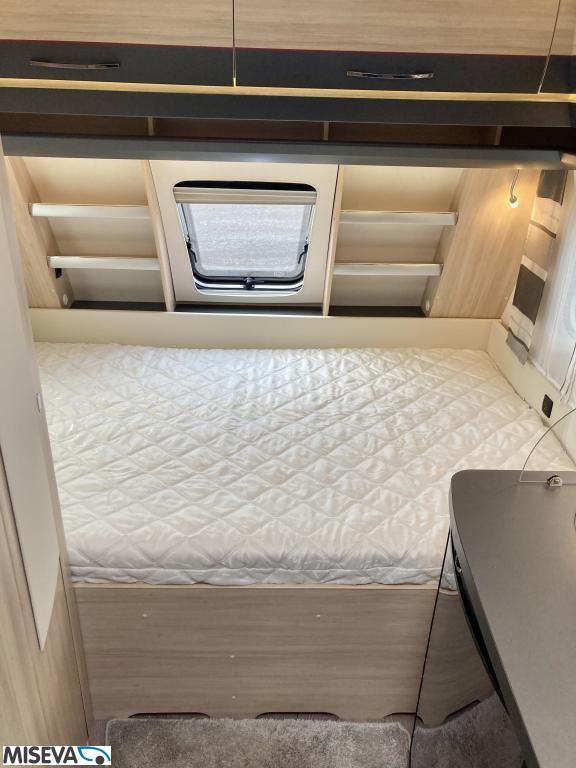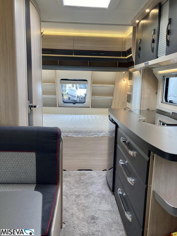 Pohjaratkaisussa edessä poikittainen parivuode. Keskiosassa Wc-tila sekä keittiö. Takaosassa sohvaryhmä sekä kaappitilaa.
