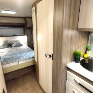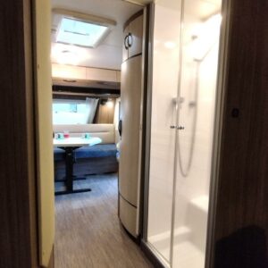 Vaunun takaosassa muhkea saarekevuode ja erilliset suihku-/ WC-tilat. Vaunun etuosasta löytyy valoisa L- pöytäryhmä.