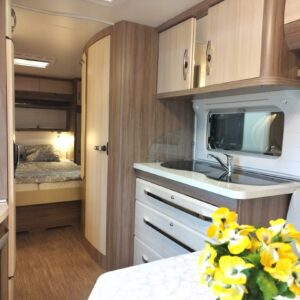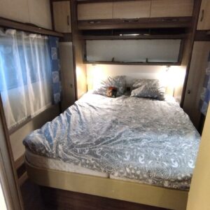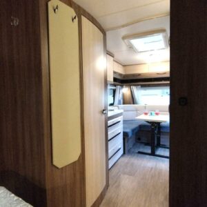 Vaunun takaosassa muhkea saarekevuode ja erilliset suihku-/ WC-tilat. Vaunun etuosasta löytyy valoisa L- pöytäryhmä.