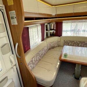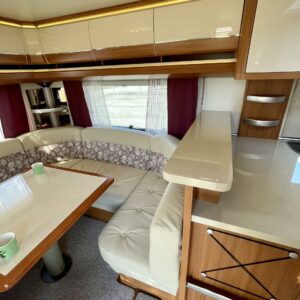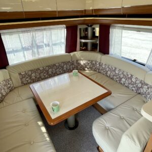 Ihan helmi! Todella hienossa kunnossa niin sisältä kun päältäkin. Sisustaltaan tyylikäs ja moderni, mutta kuitenkin kodikkaan oloinen. Vaunun etuosaa hallitsee runsaan kokokoinen (lev.) pitkittäinen parivuode ja sen vieressä on WC/kylpyhuonetilat. Vaunun tämän osion voi rauhoittaa muulta hälinältä paljeoven avulla. Katseen vangitsija on vaunun keskiosassa sijaitseva upea L-keittiö. Korkeakiiltoiset valkoiset kalusteet suorastaan uhkuvat tyyliä ja leveät vetolaatikot tarjoavat paljon säilytystilaa tavaroille. Jääkaappi on myös mallia iso, eli eväsmäärä matkalle saadaan maksimoitua. Vaunun takaosassa on reilun kokoinen G-sovaryhmä minne mahtuu iltaa istumaan isompikin seurue. Istuinryhmä on tietysti nahkaverhoiltu ja tästä voi tarvittaessa myös sijata vuoteen kahdelle henkilölle.Lämmityksenä toimii tehokkaan ja tasaisen lämmön antava Alden nestekeskuslämmitys. Lisäherkkuna on jalalle oikein mukavan tuntuinen sähköinen lattianlämmitys. Pihan puolella grillit ja pöydät saadaan suojaan lähes koko vaunun mittaisen markiisin alle. Grillin kanssa ei tarvitse touhuta pullojumppaa, koska varusteista löytyy myös kaasun ulosotto. Todella upea vanu juuri katsastettuna valmiina kesä retkiin.