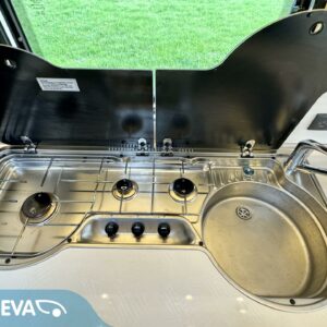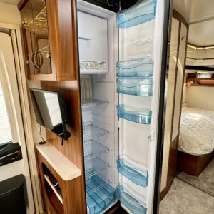 Keskeltä vaunua löytyy korkealla jääkaappi- pakastimella varustettu keittiösaareke ja pesuhuone/ WC.