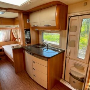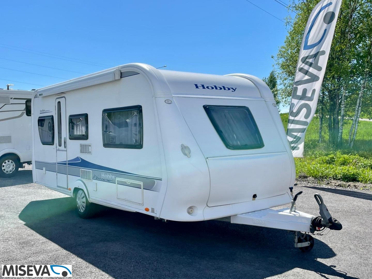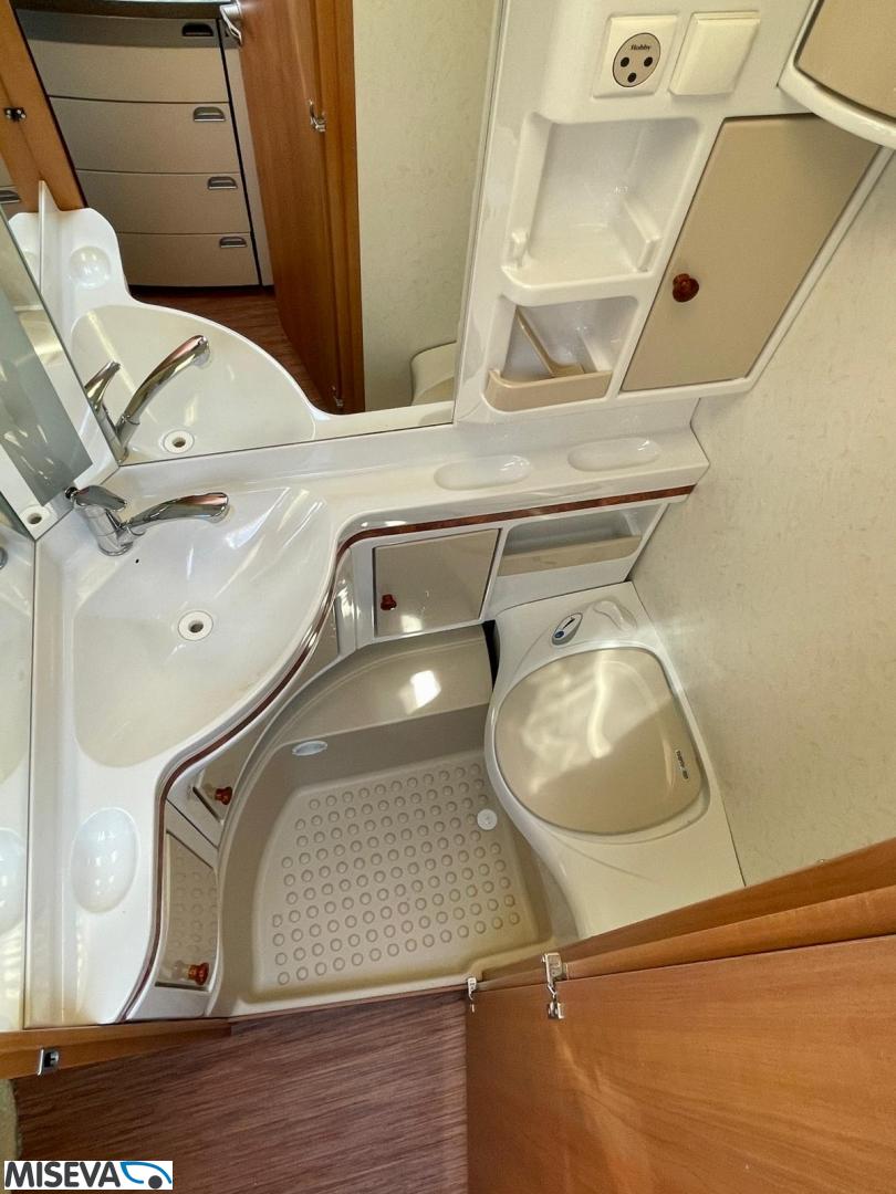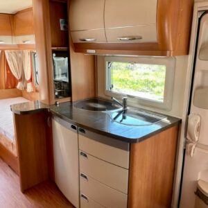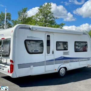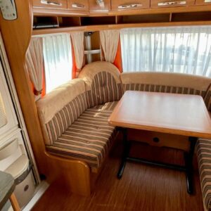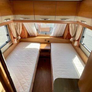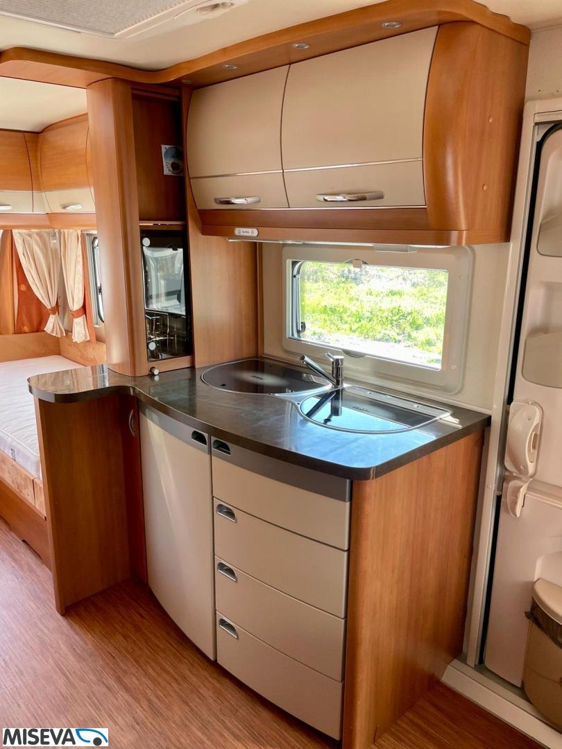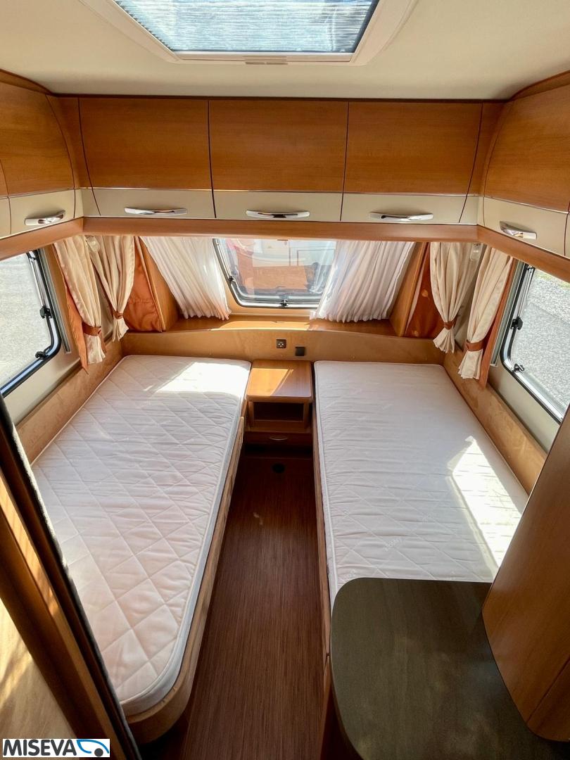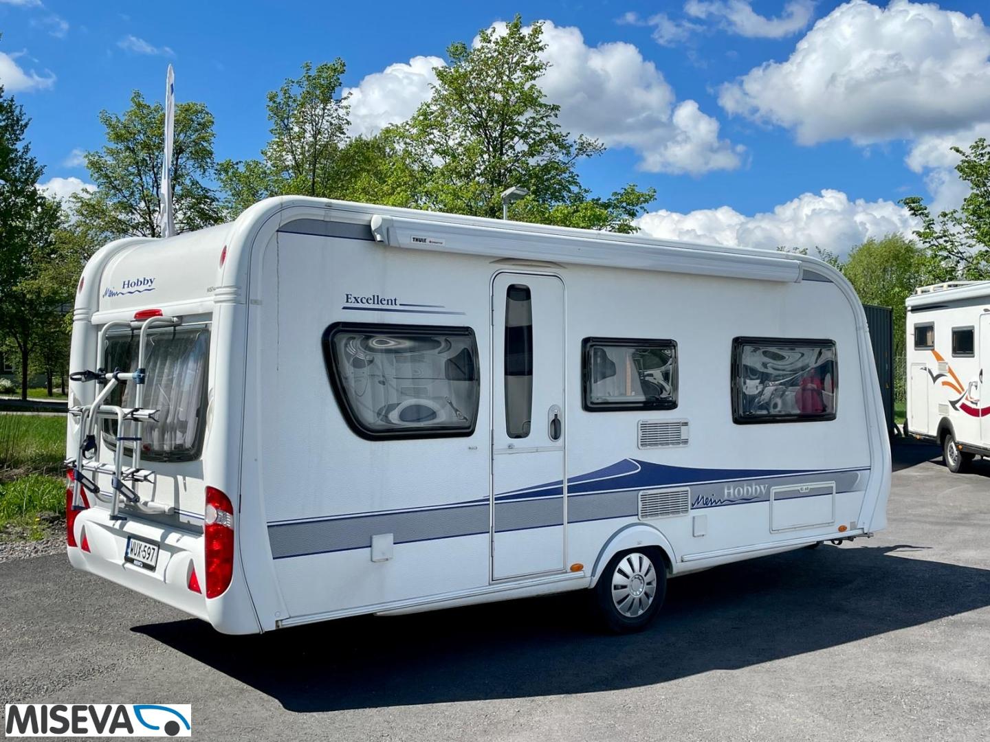 Varusteina mm: Truma- keskuslämmitys sähköpatruunalla, Kotelomarkiisi, Pyöräteline, TV- antenni,..