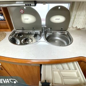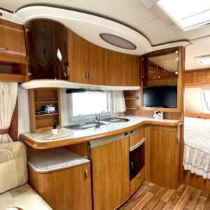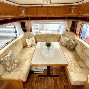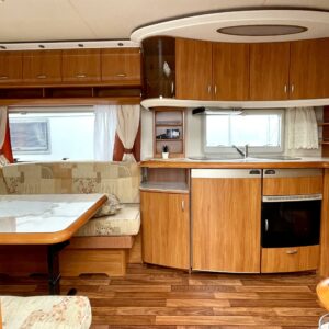 Alde, Jääkaappi, Kaasu-uuni, Kasetti WC, Kasettiverhot, Kattoluukku, Lattialämmitys, Liesi, Lämminvesiboileri, Nestekiertolämmitys, Pakastelokero, Parivuode, Pesuallas, Sähköpatruuna, TV-antenni tai lautasantenni, Tukijalat, Lattialämmitys (sähkö), sähkön ulosotto, televisio, Asuinosan hyttysovi/verho