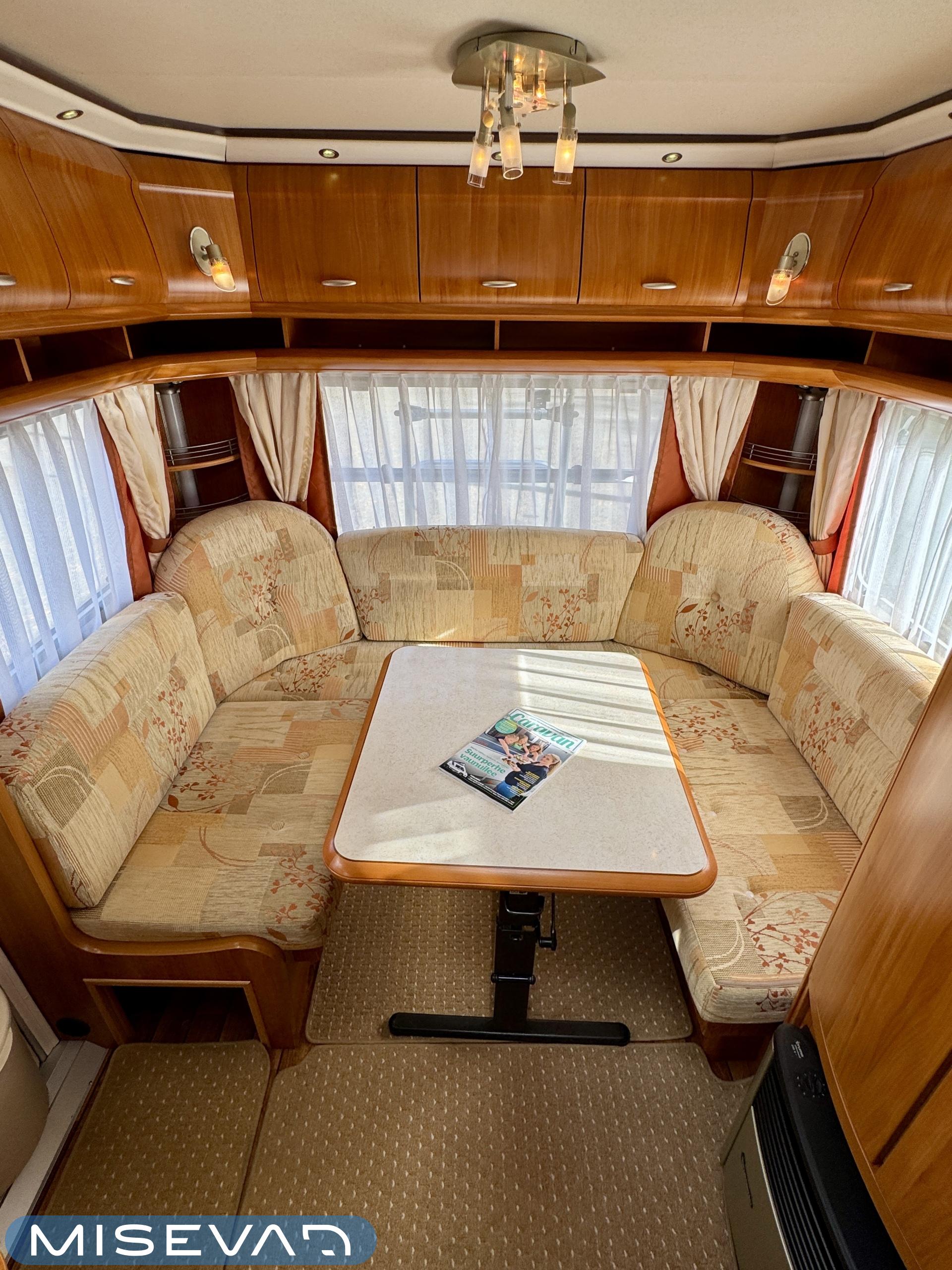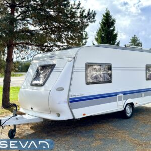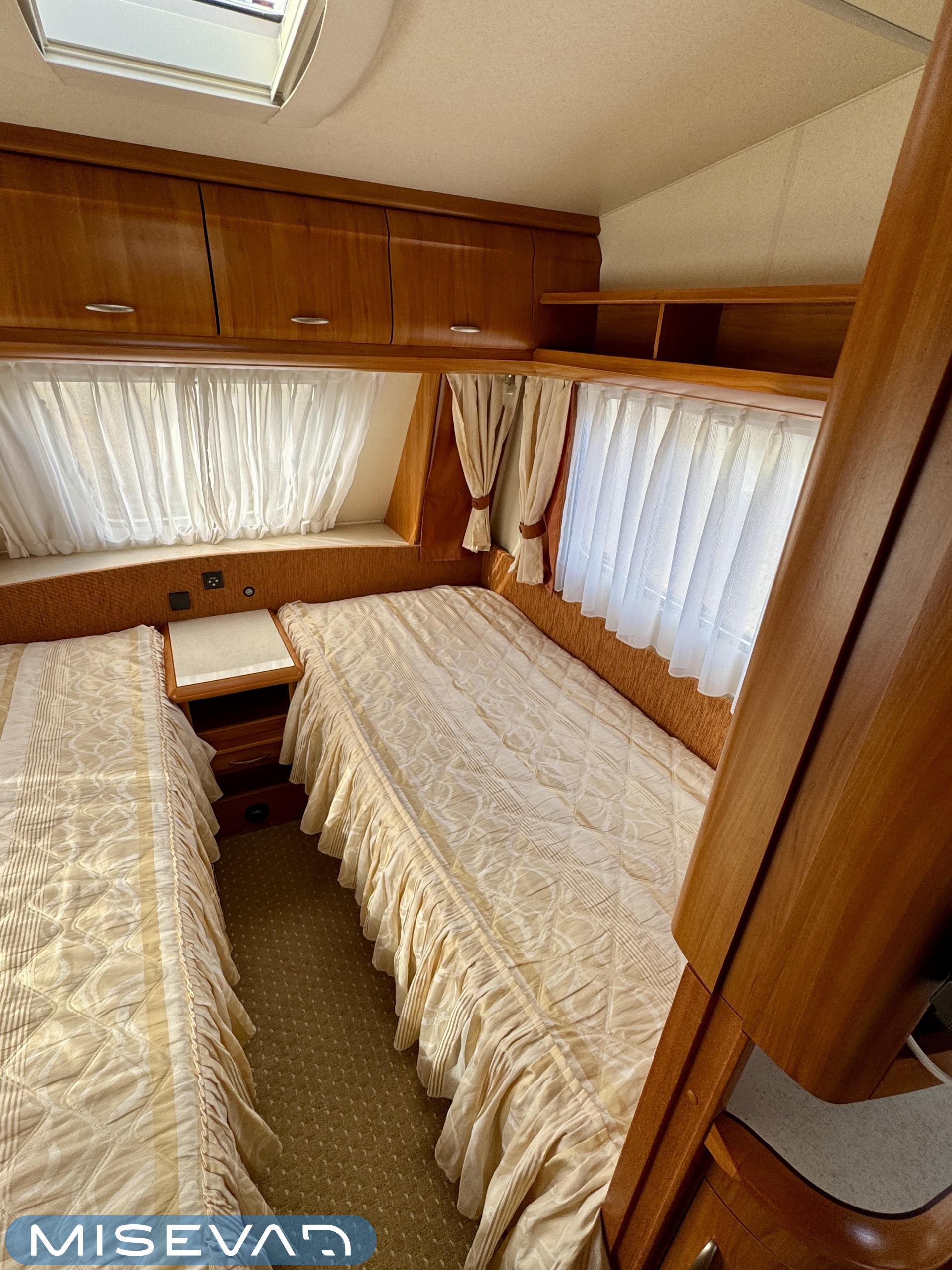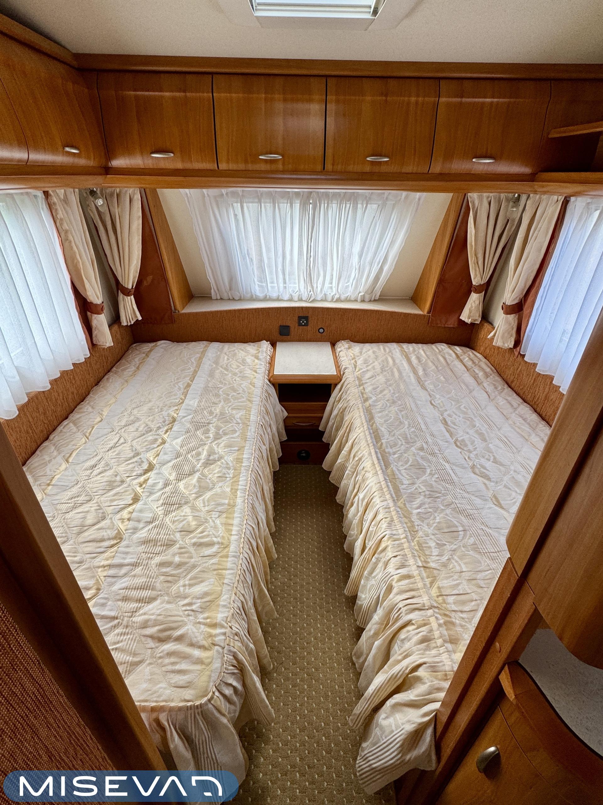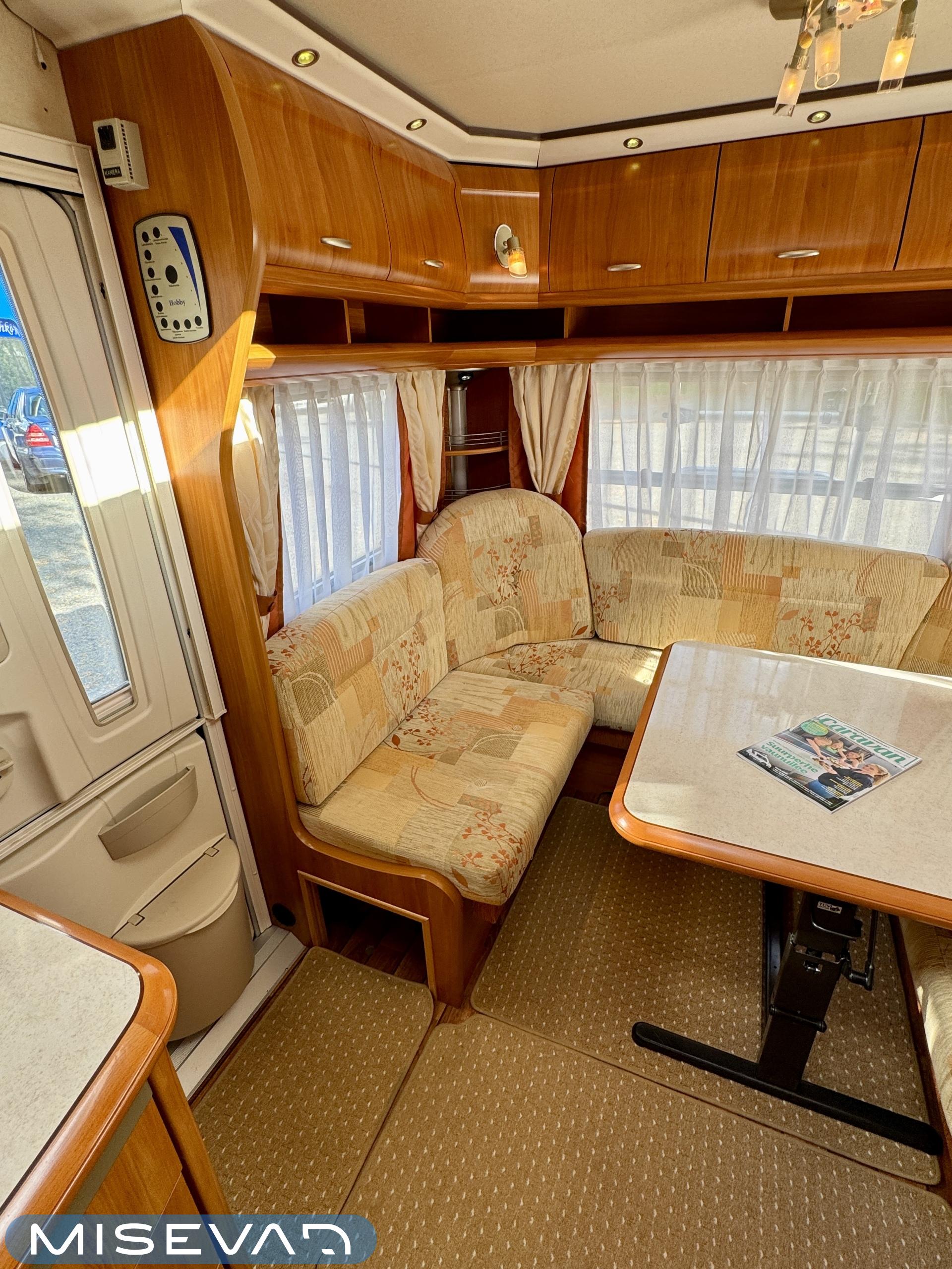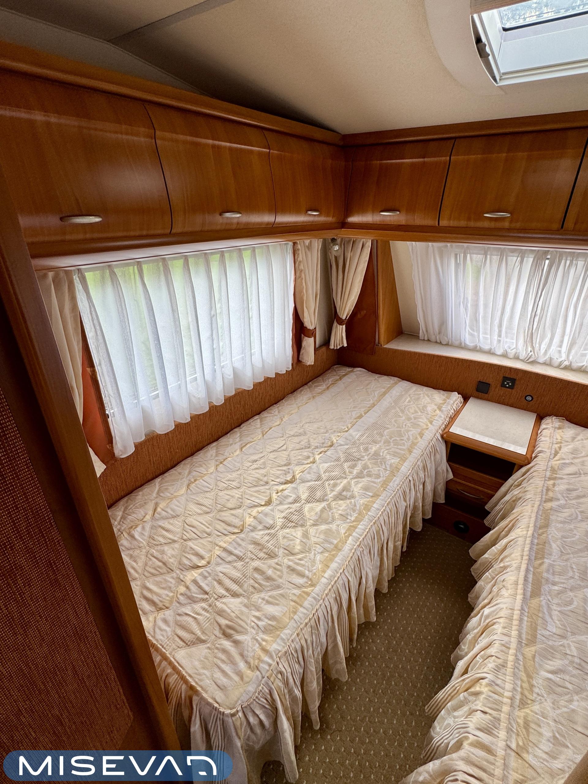 Siistissä kunnossa säilynyt pinnoiltaan niin sisältä, kun ulkoakin. Vuoderatkaisuna markkinoiden halutuimmat erillisvuoteet. Vaunussa on myös kohtuullisen mukavat varusteet ja helmenä mainittakoon Dometicin ilmastointi, millä saadaan kesäkuumalla sisätilat mukavan vilpoisiksi. Lämmityksestä huolehtii Trumaticin ilmakeskuslämmitys sähkövastuksilla höystettynä. Ja jos aletaan oikein hifistelemään, niin lattiakin saadaan jalalle miellyttävän lämpöiseksi sähköisen lattianlämmityksen avulla. Takana ison U-ryhmän yläpuolella oleva kookas kattoluukku antaa mukavasti luonnonvaloa sisään. Viihtyisässä keittiössä on mukava kokkailla päivän antimet. Edessä oleva makuuhuone on erotettavissa omaksi osaksi liukuoven avulla. Polkupyörätkin mahtuvat mukaan matkaan takaseinän pyörätelineeseen.