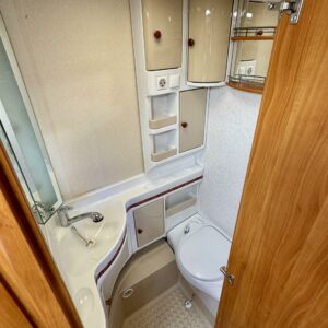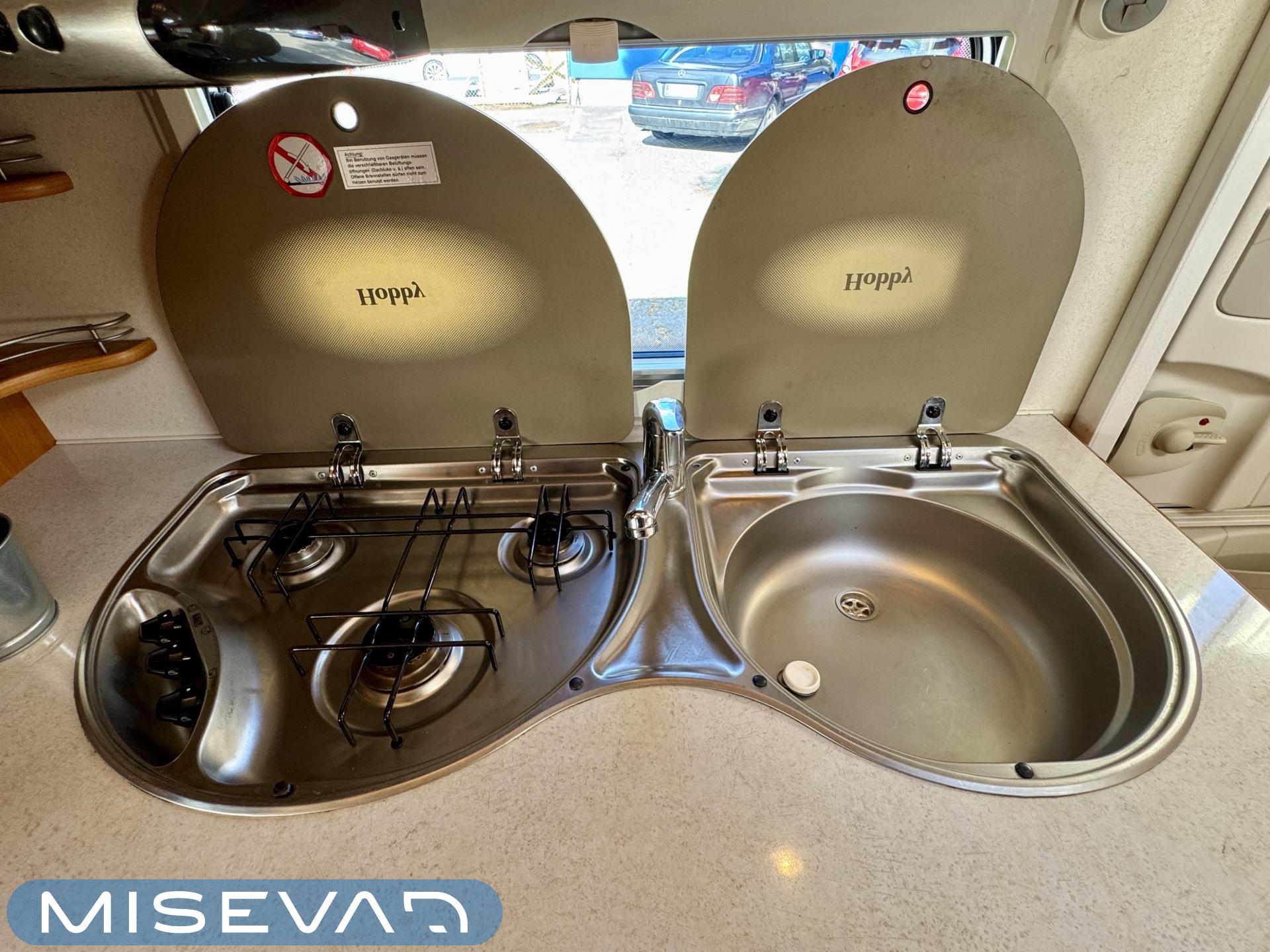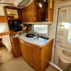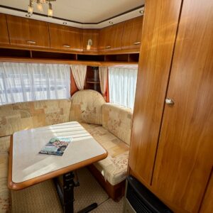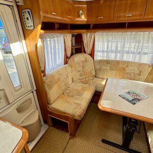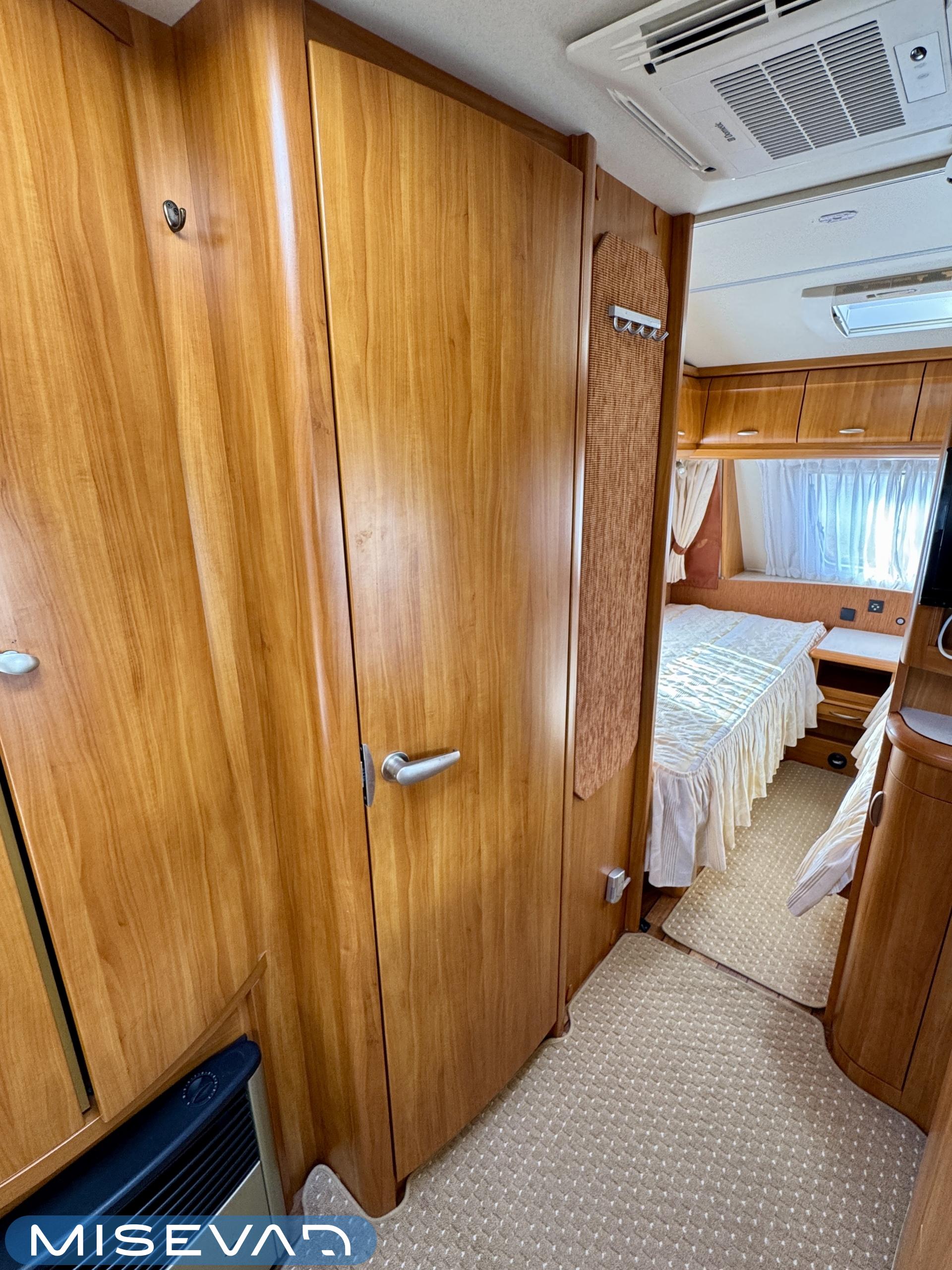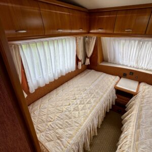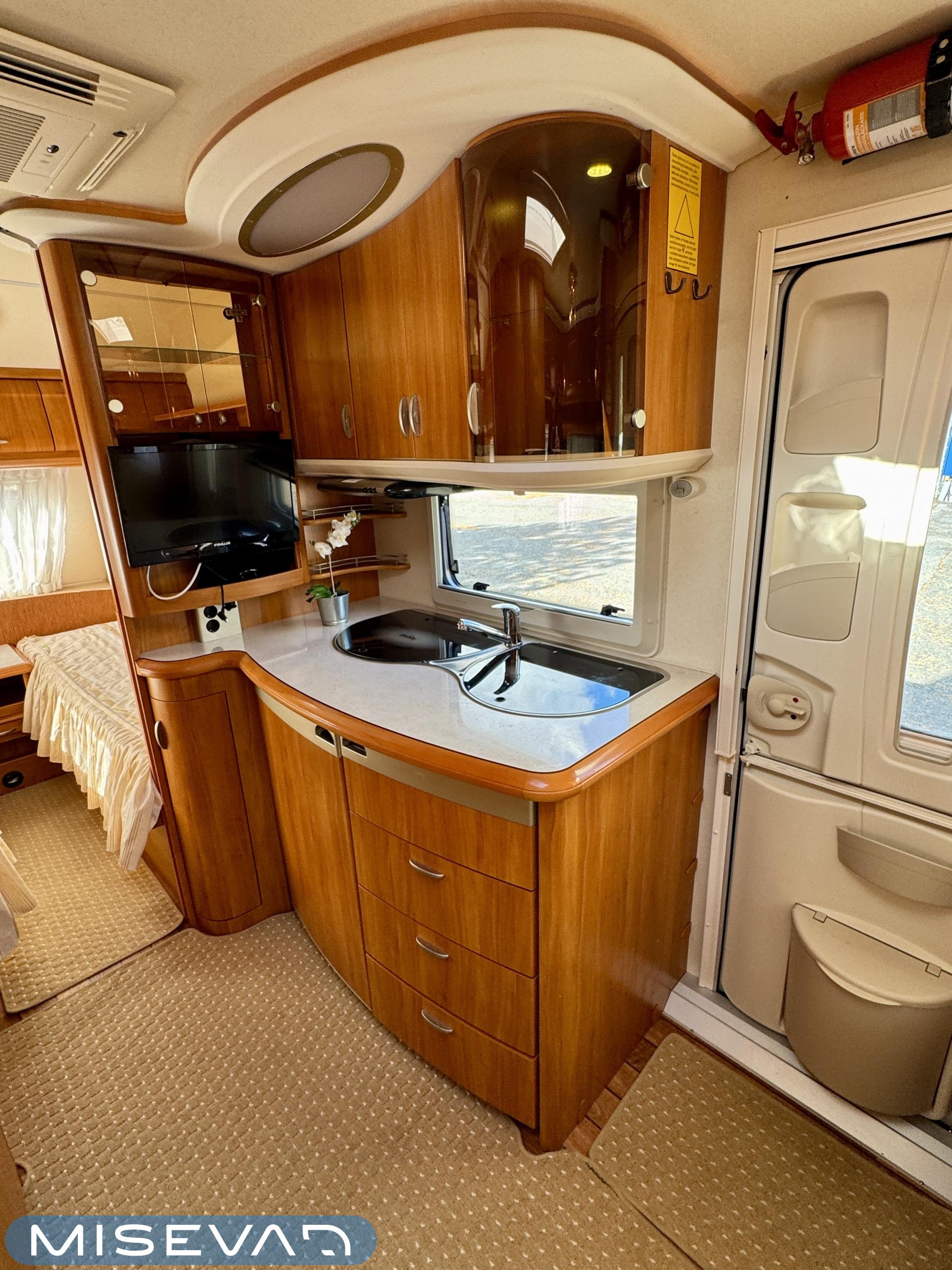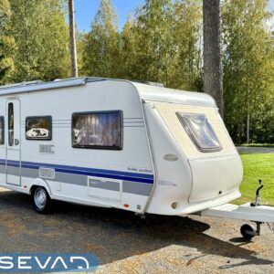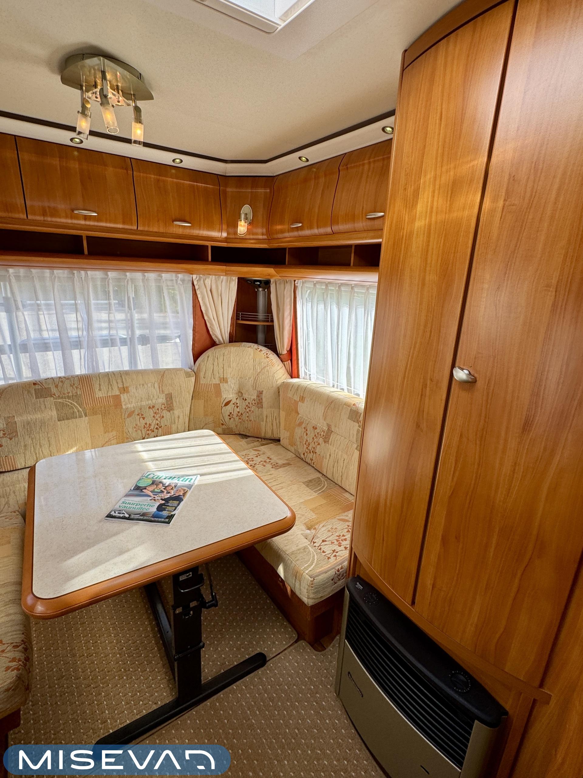 Siistissä kunnossa säilynyt pinnoiltaan niin sisältä, kun ulkoakin. Vuoderatkaisuna markkinoiden halutuimmat erillisvuoteet. Vaunussa on myös kohtuullisen mukavat varusteet ja helmenä mainittakoon Dometicin ilmastointi, millä saadaan kesäkuumalla sisätilat mukavan vilpoisiksi. Lämmityksestä huolehtii Trumaticin ilmakeskuslämmitys sähkövastuksilla höystettynä. Ja jos aletaan oikein hifistelemään, niin lattiakin saadaan jalalle miellyttävän lämpöiseksi sähköisen lattianlämmityksen avulla. Takana ison U-ryhmän yläpuolella oleva kookas kattoluukku antaa mukavasti luonnonvaloa sisään. Viihtyisässä keittiössä on mukava kokkailla päivän antimet. Edessä oleva makuuhuone on erotettavissa omaksi osaksi liukuoven avulla. Polkupyörätkin mahtuvat mukaan matkaan takaseinän pyörätelineeseen.