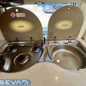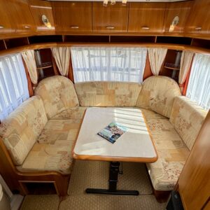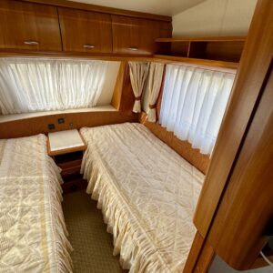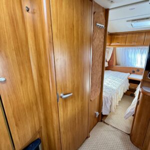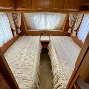 Edessä pitkittäiset erillisvuoteet. Keskellä keittiö perusvarustuksella, sekä WC/kylpyhuonetilat. Takana kookas U-ryhmä mistä saa sijattua vuoteen kahdelle henkilölle.