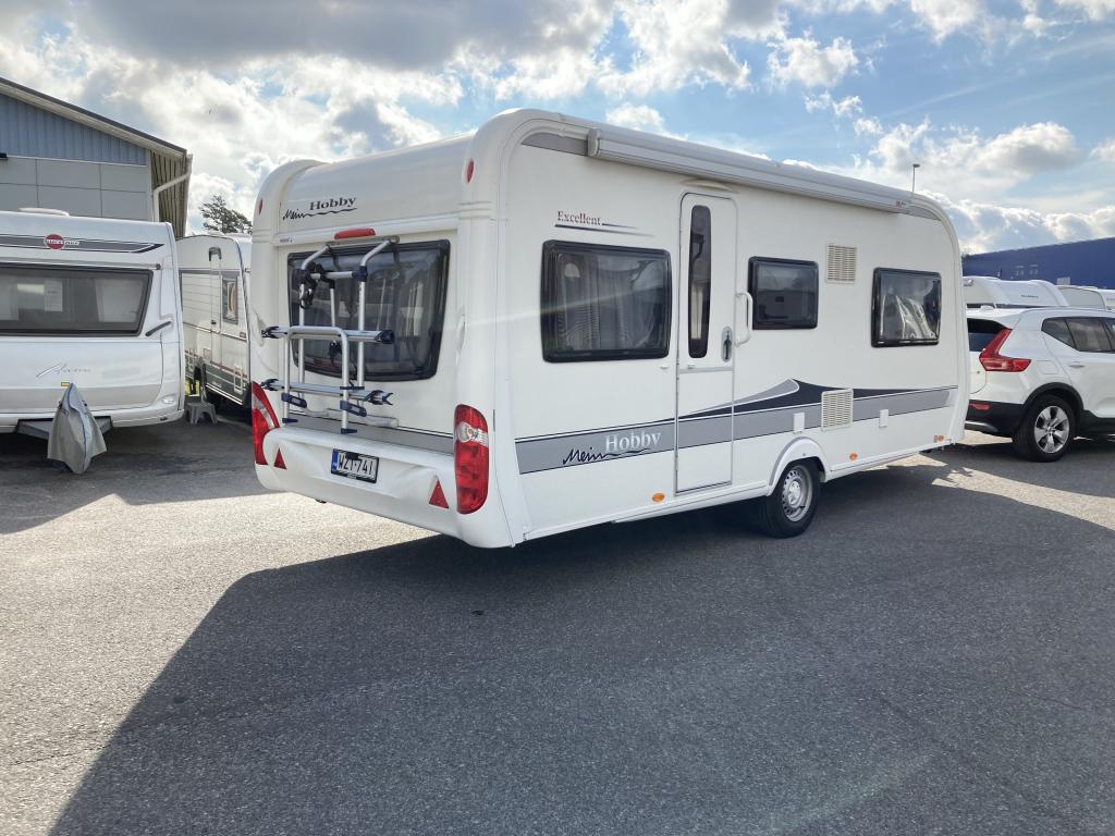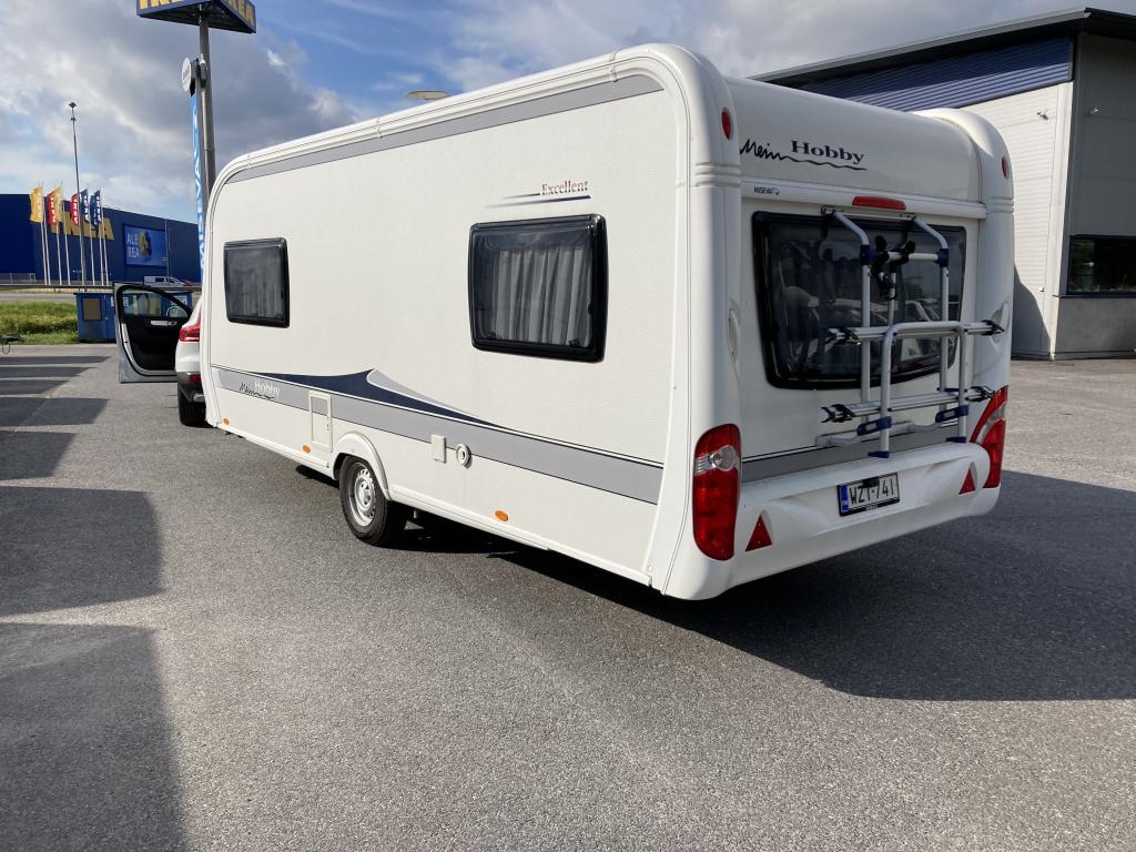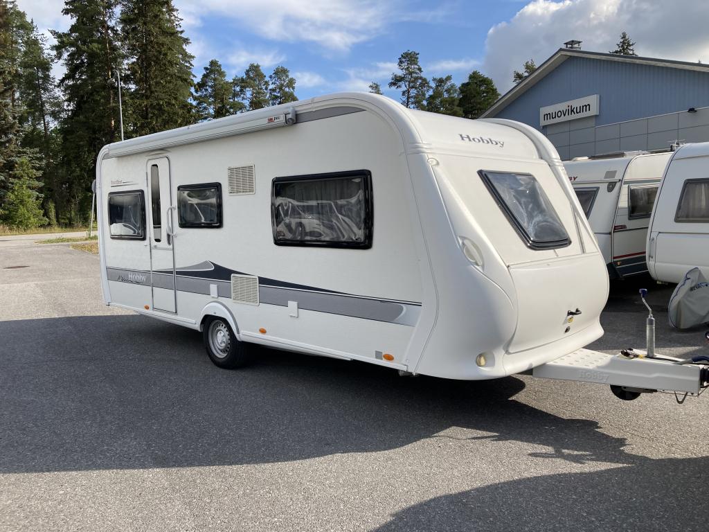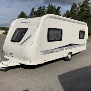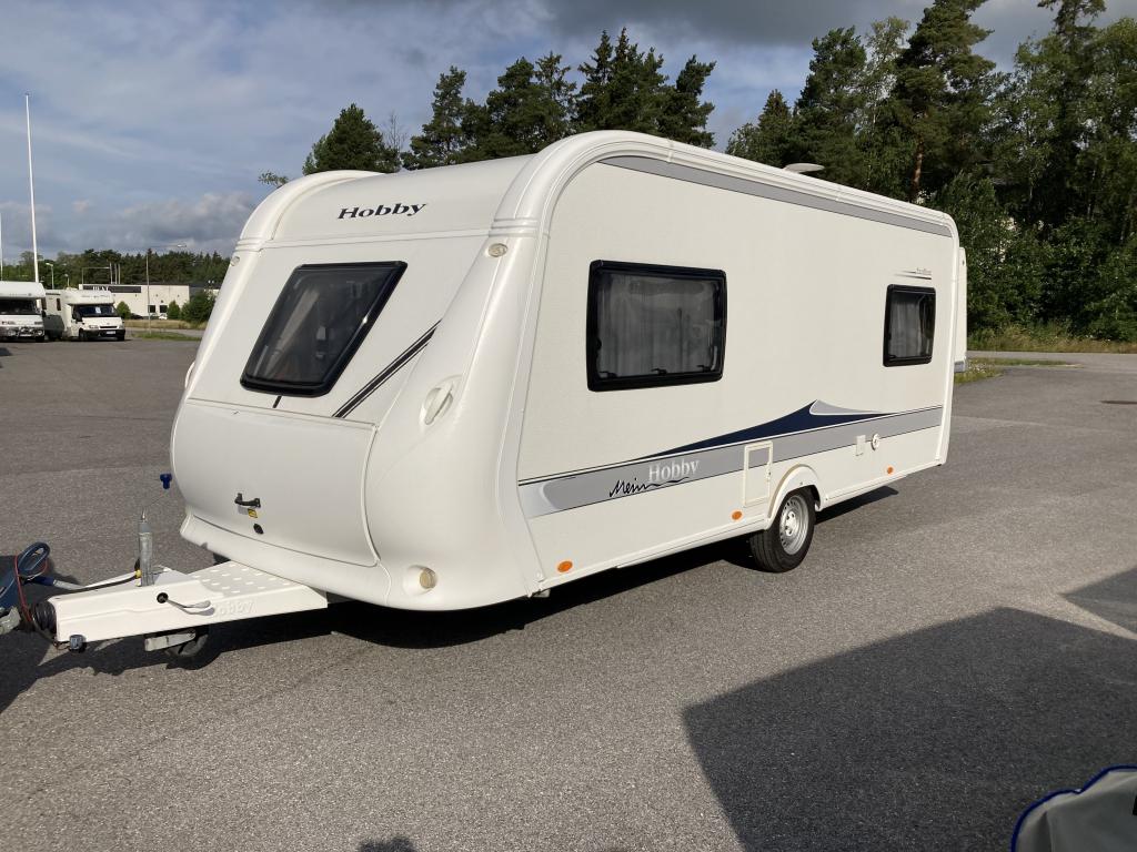 Mukavan kokoinen erillisvuoteinen Hobby hyvillä varusteilla. Edessä erillisvuoteet, jotka voi yhdistää suureksi parivuoteeksi. Keskellä WC ja keittiö. Keittiössä iso jääkaappi. Perällä U-sohvaryhmä.
