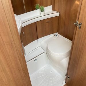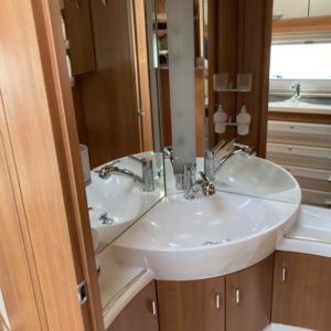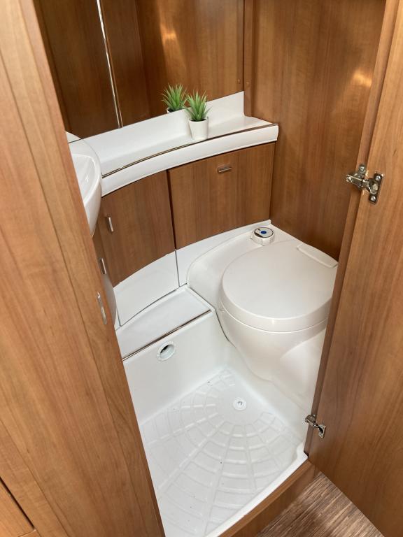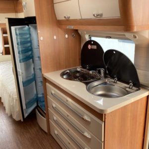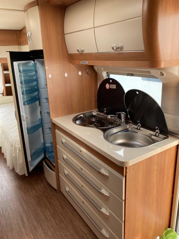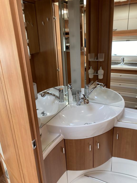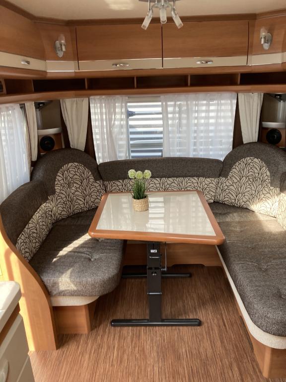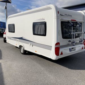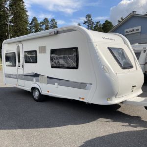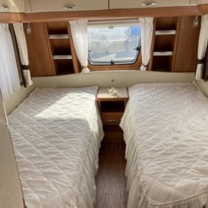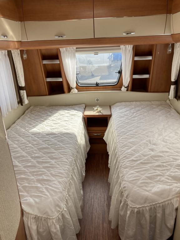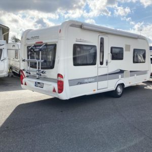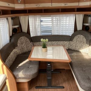 Mukavan kokoinen erillisvuoteinen Hobby hyvillä varusteilla. Edessä erillisvuoteet, jotka voi yhdistää suureksi parivuoteeksi. Keskellä WC ja keittiö. Keittiössä iso jääkaappi. Perällä U-sohvaryhmä.