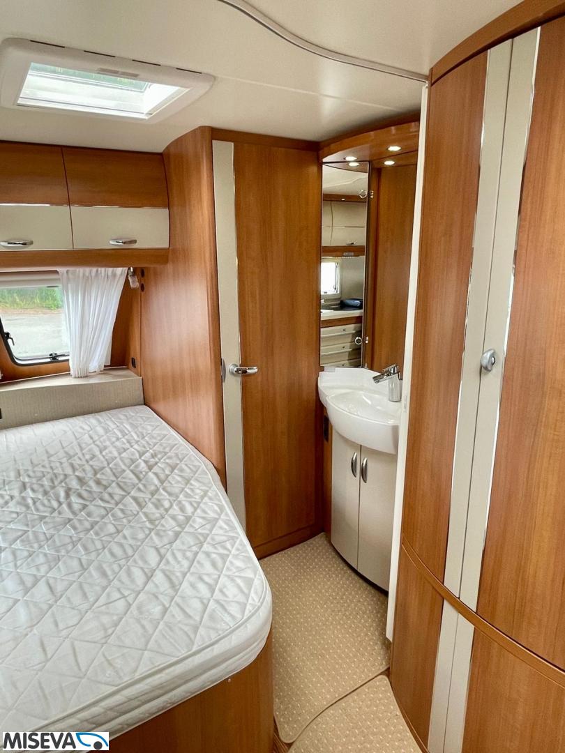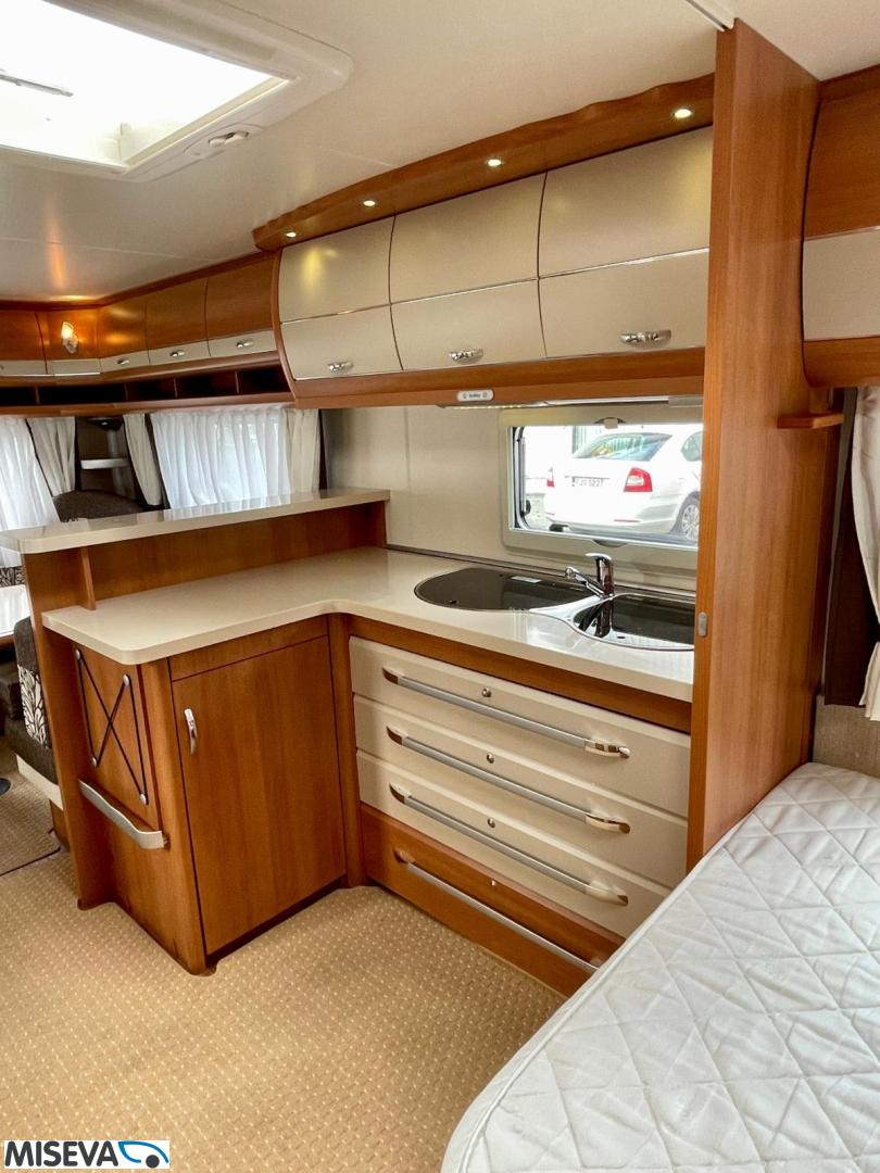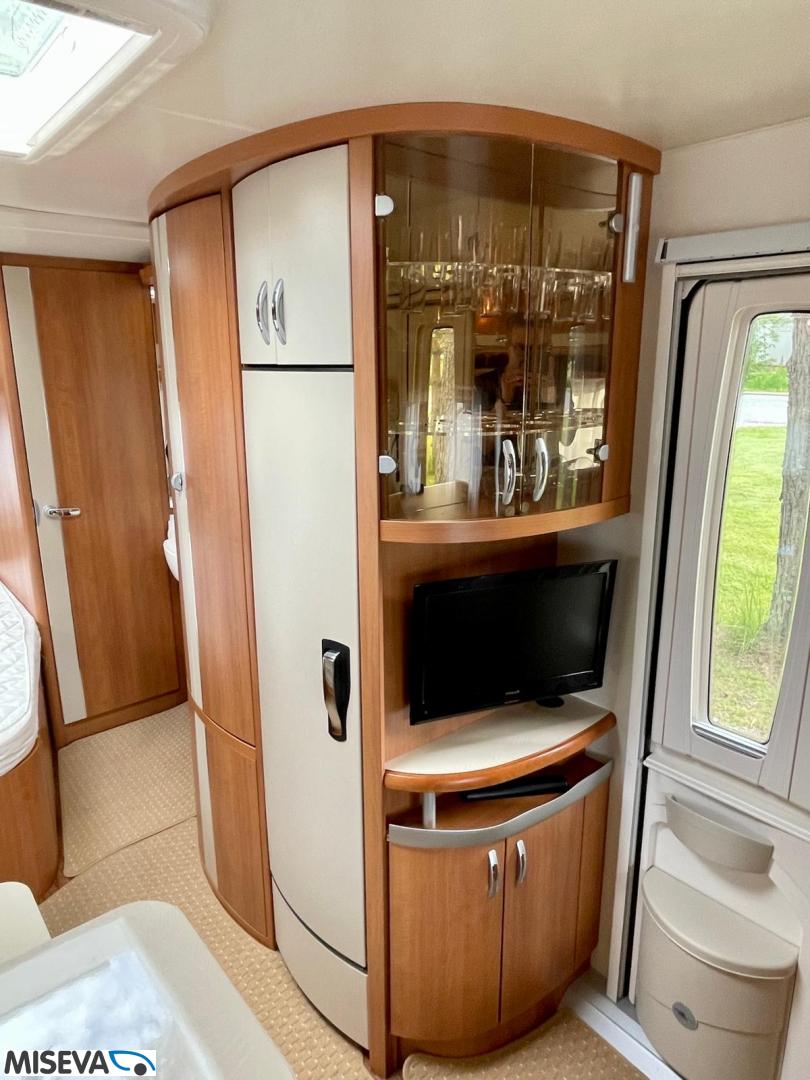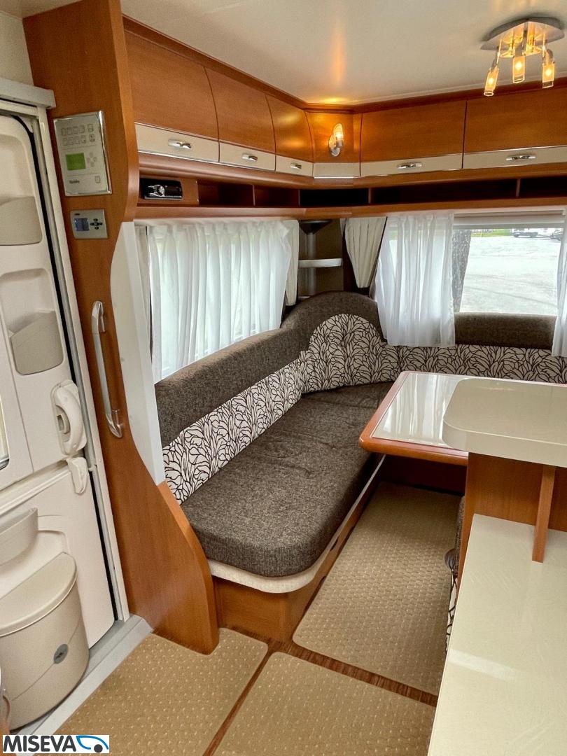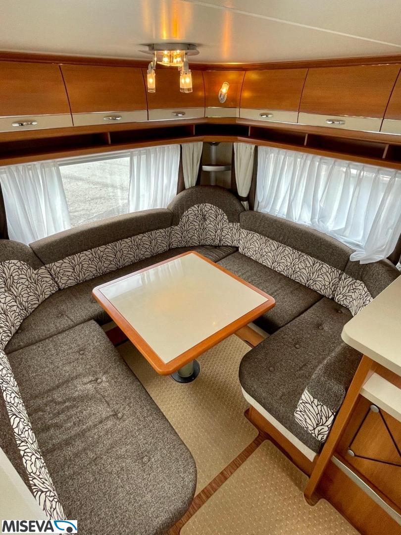 Vaunun etuosassa pitkittäinen parivuode ja pesuhuone/ WC. Takaosasta löytyy hulppea pöytäryhmä jonka ympärille mahtuu mukavasti 7 -8 ihmistä iltaa istumaan. Keittiön varustukseen kuuluu korkea jääkaappi- pakastin.