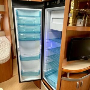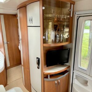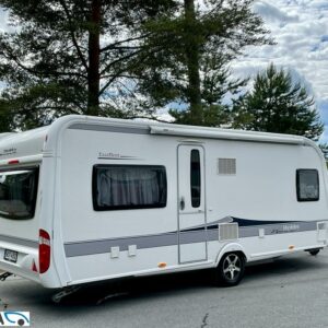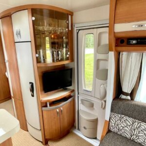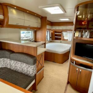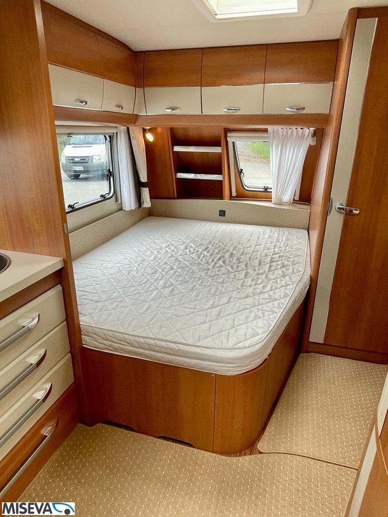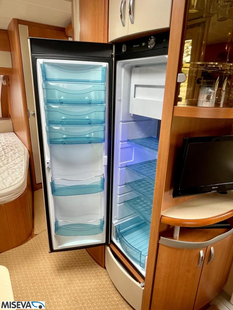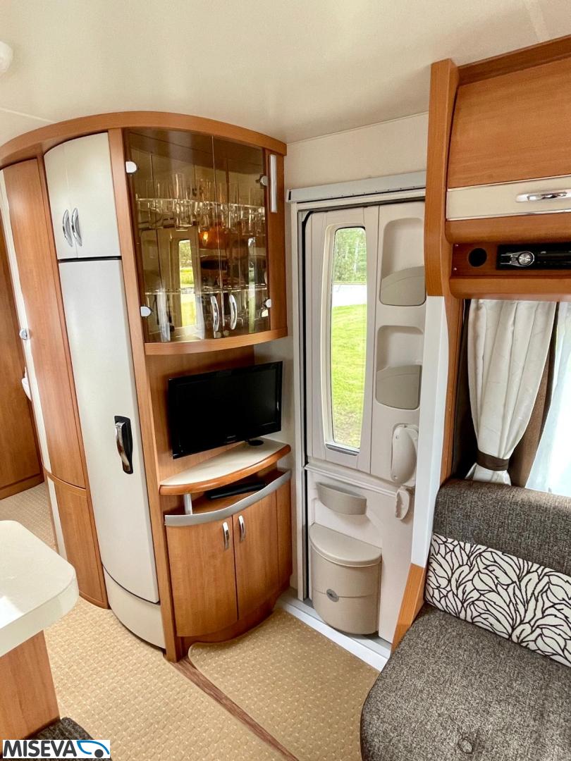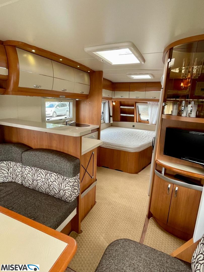 Vaunun etuosassa pitkittäinen parivuode ja pesuhuone/ WC. Takaosasta löytyy hulppea pöytäryhmä jonka ympärille mahtuu mukavasti 7 -8 ihmistä iltaa istumaan. Keittiön varustukseen kuuluu korkea jääkaappi- pakastin.