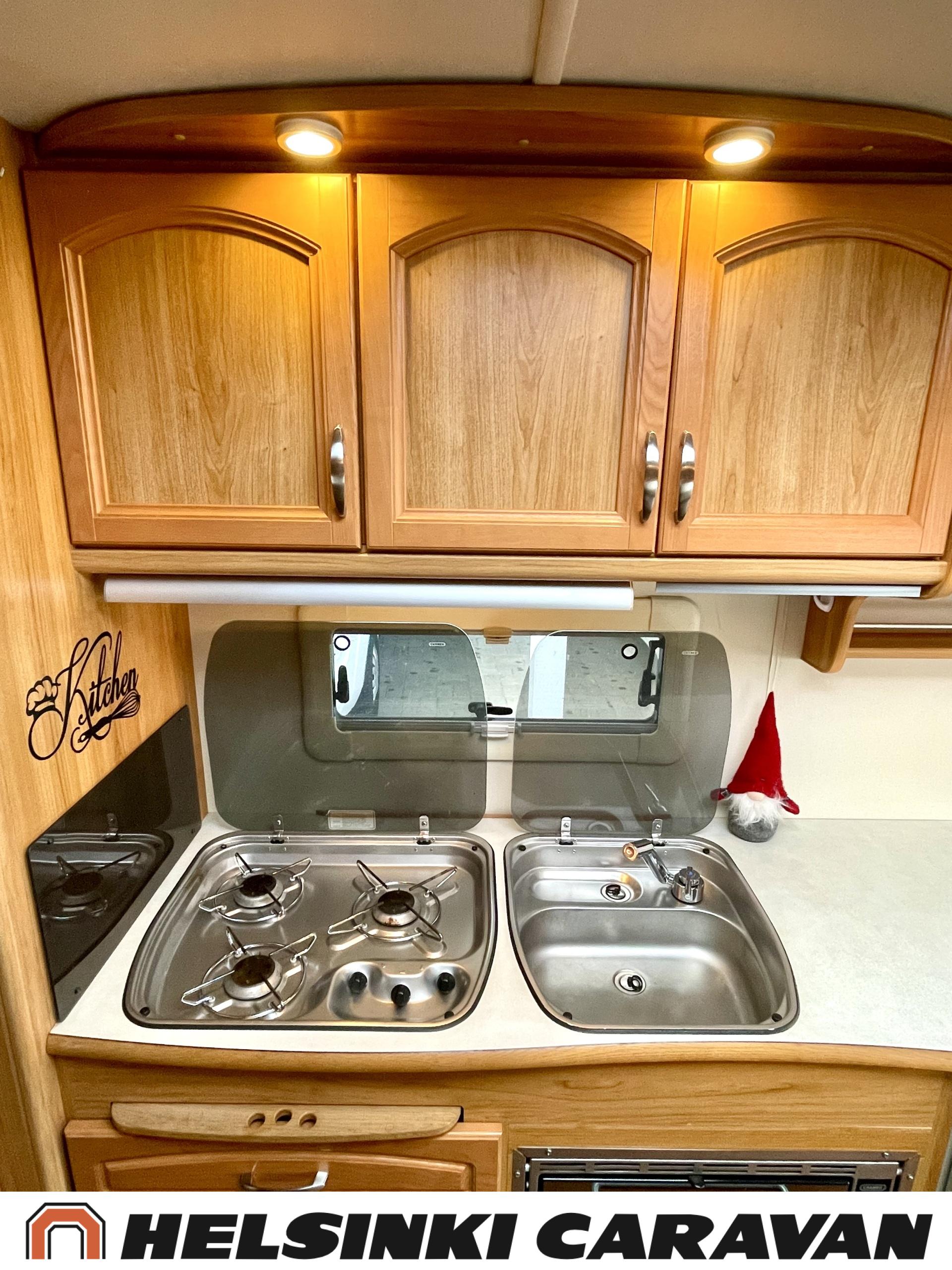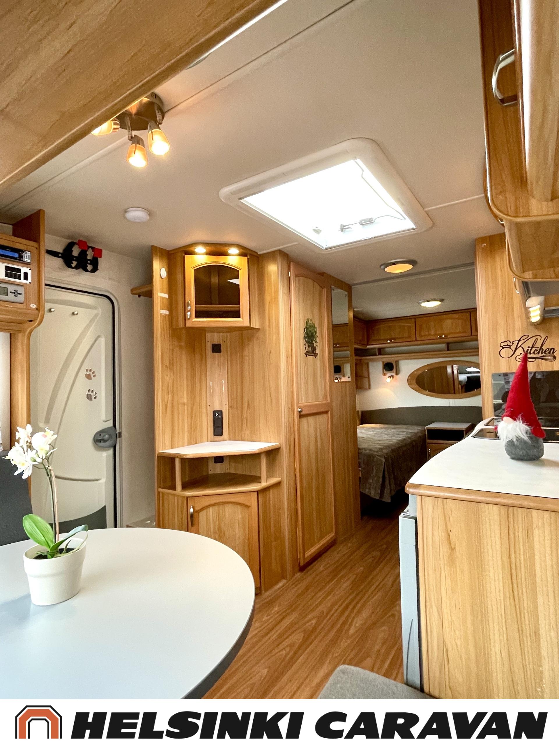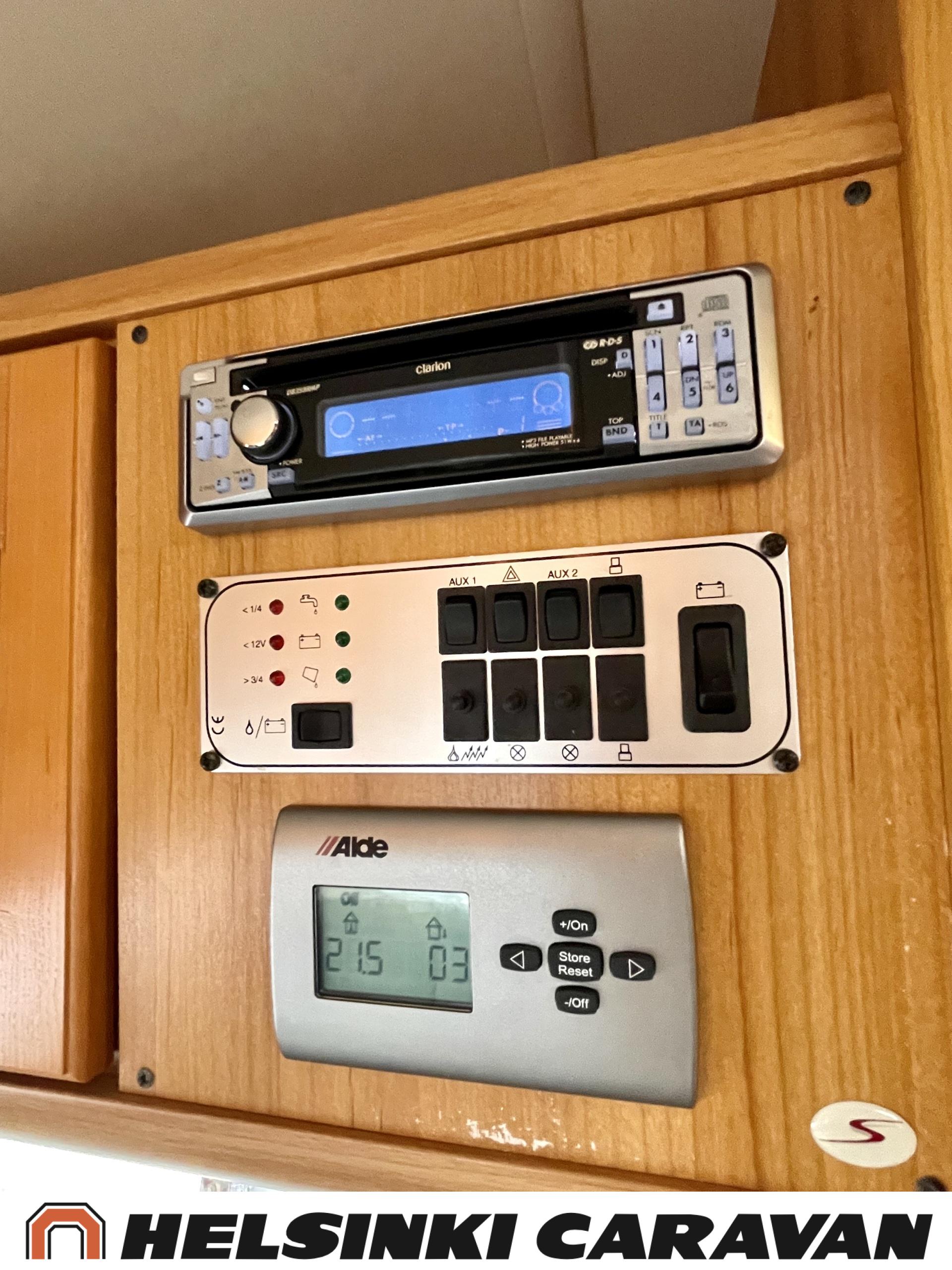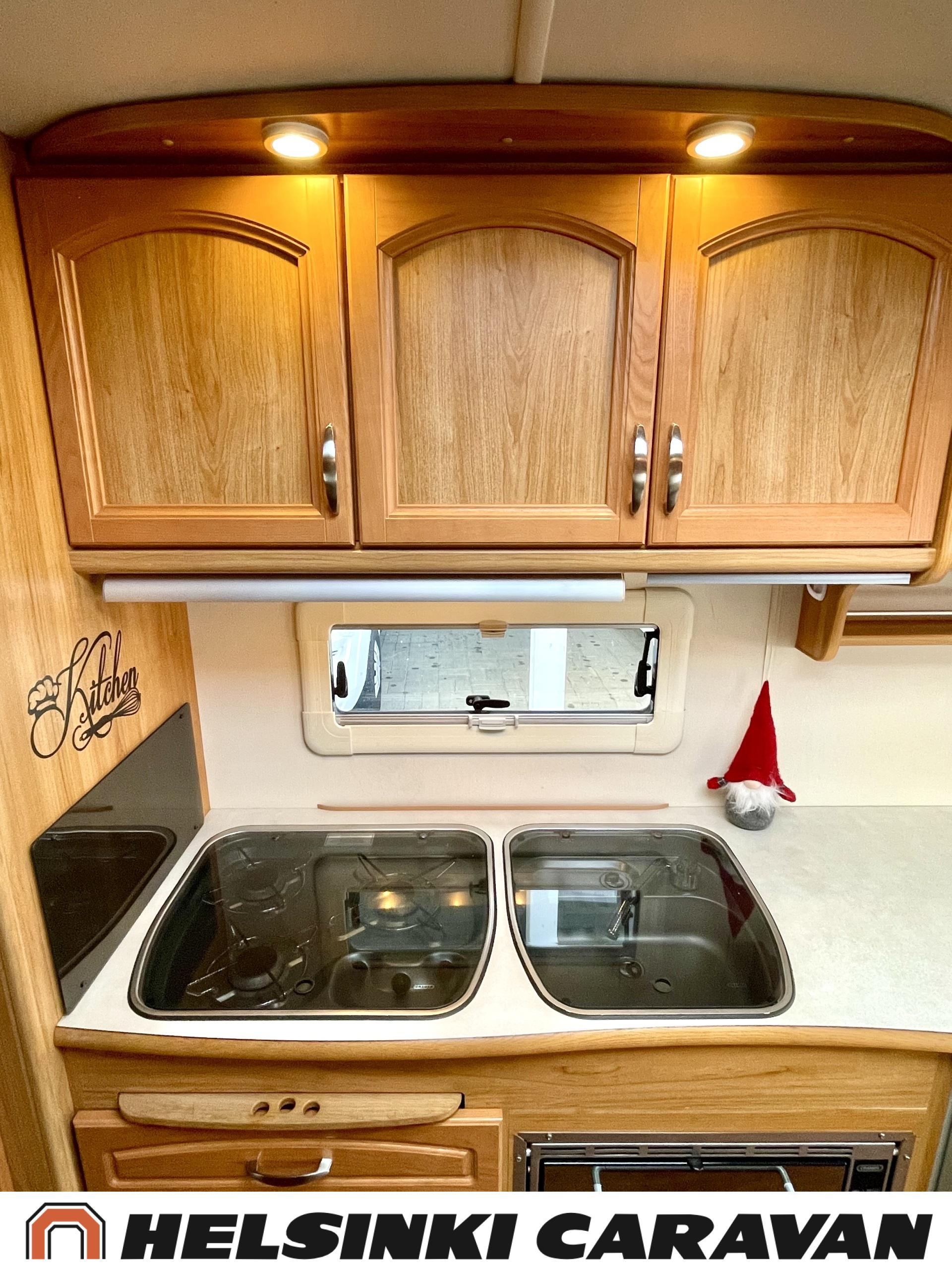 Alde,Erillisvuoteet,Jääkaappi,Kaasu-uuni,Kasetti WC,Kasettiverhot,Keskuslämmitys,Liesi,Lämminvesiboileri,Nahkasisusta,Nestekiertolämmitys,Sähköpatruuna,Tukijalat,TV-antenni/lautasantenni