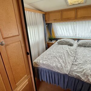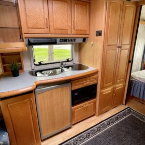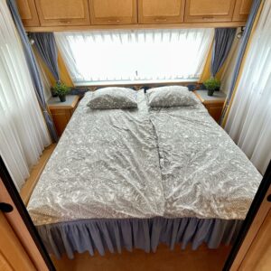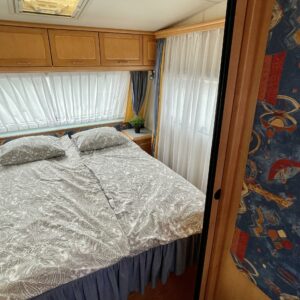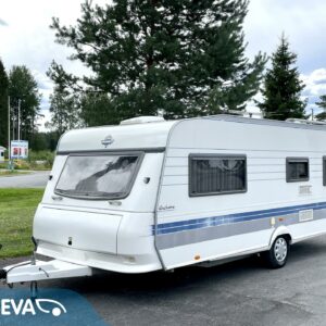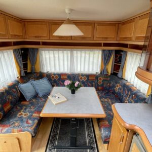 Ikäisekseen ryhdikäs Hobby avaralla pohjaratkaisulla. Tasaisen lämmön takeena Alde- nestekeskuslämmitys.